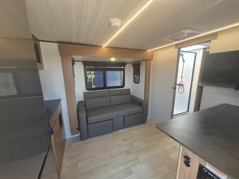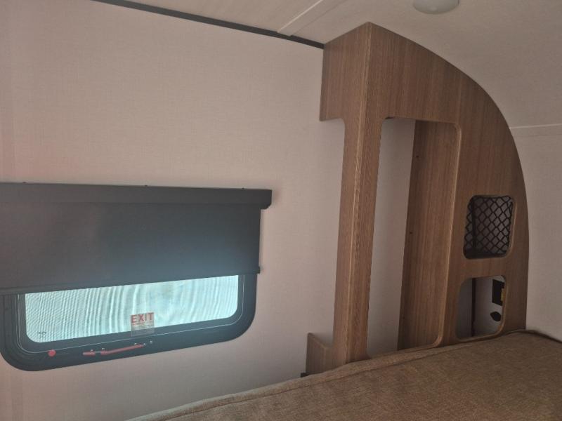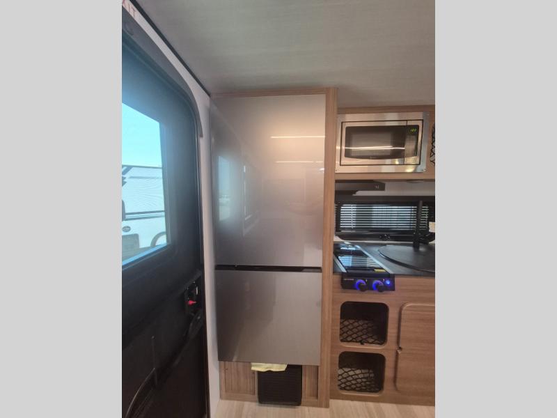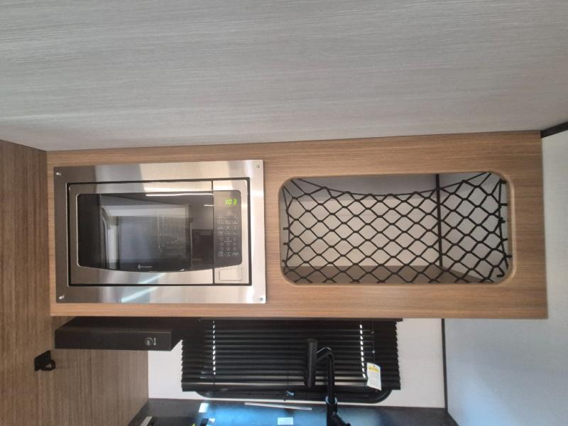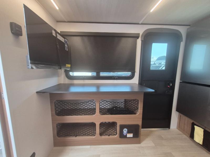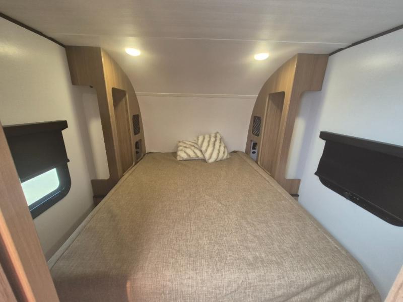 You will love this travel trailer's stunning rear kitchen design! The theater dinette provides a comfortable spot for meals and relaxation, while the bar countertop with stools offers a space for socializing and enjoying drinks. Also, overhead cabinets provide ample storage for your kitchen essentials. In the center of this travel trailer, the walkthrough bathroom features a convenient flip-down sink and linen closet, making it easy to get ready and stay organized. Moreover, the front bedroom is a serene retreat, featuring a spacious 60” x 74” bed with cubbies beside the bed for storing your favorite books, glasses, or other personal items. Plus, a 13' awning provides shade and protection from the elements, creating a comfortable outdoor living space.