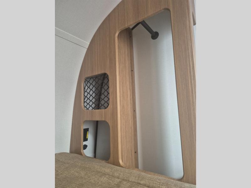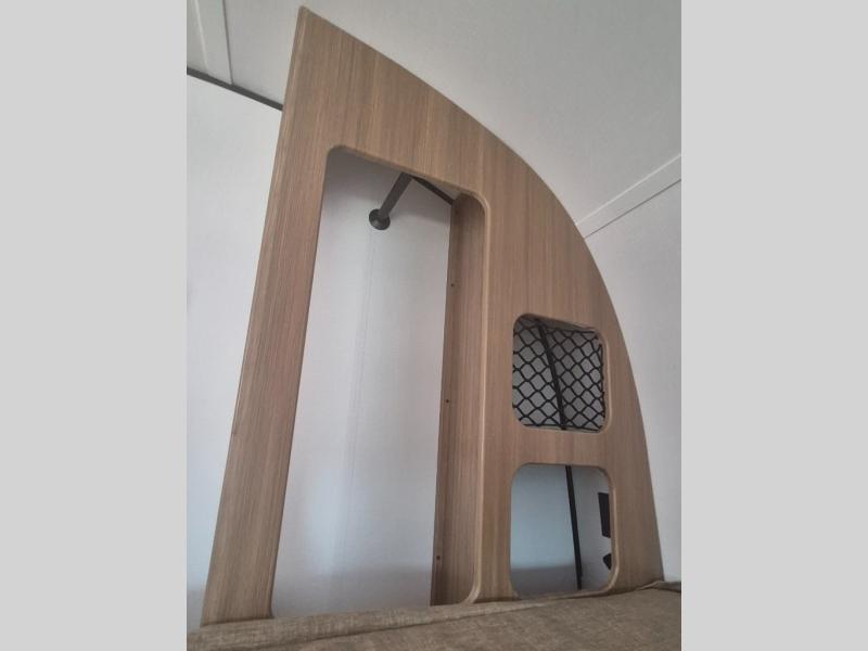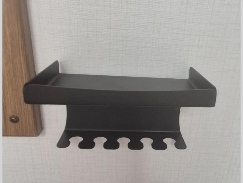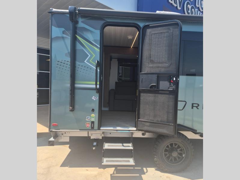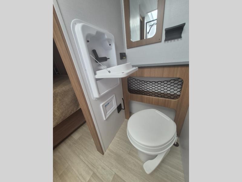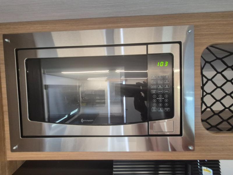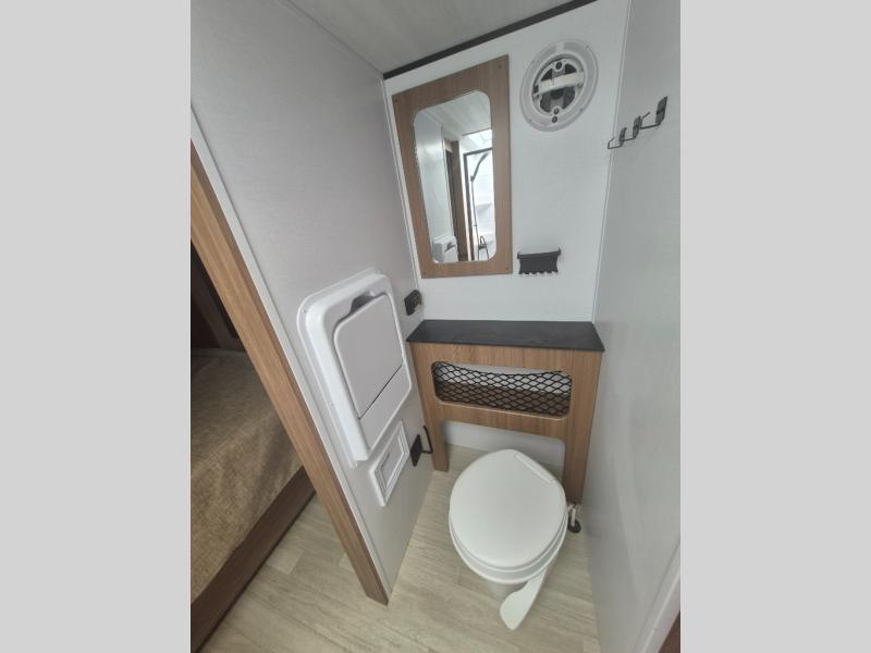 You will love this travel trailer's stunning rear kitchen design! The theater dinette provides a comfortable spot for meals and relaxation, while the bar countertop with stools offers a space for socializing and enjoying drinks. Also, overhead cabinets provide ample storage for your kitchen essentials. In the center of this travel trailer, the walkthrough bathroom features a convenient flip-down sink and linen closet, making it easy to get ready and stay organized. Moreover, the front bedroom is a serene retreat, featuring a spacious 60” x 74” bed with cubbies beside the bed for storing your favorite books, glasses, or other personal items. Plus, a 13' awning provides shade and protection from the elements, creating a comfortable outdoor living space.