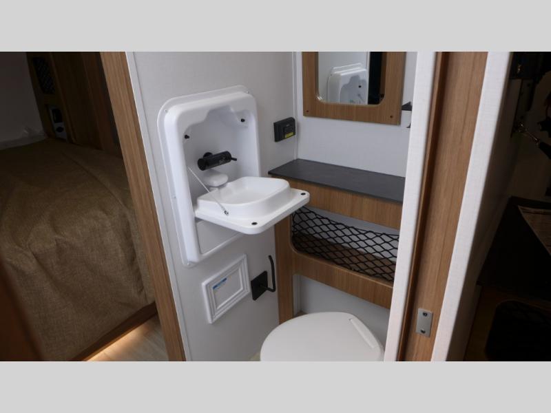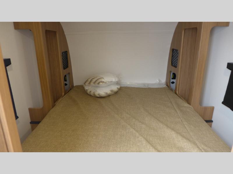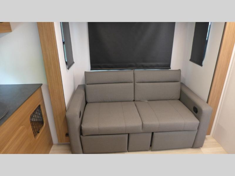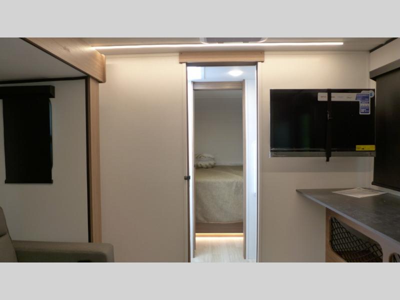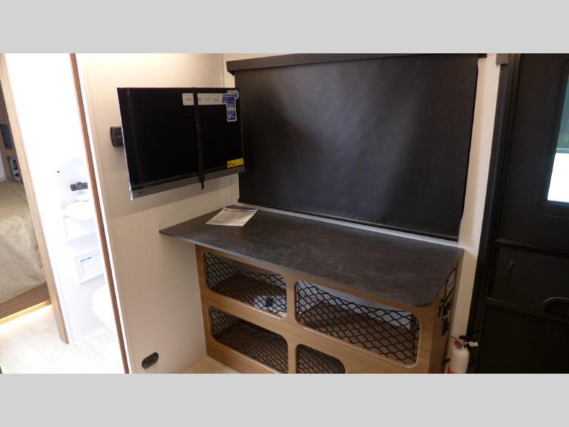 You will love this travel trailer's stunning rear kitchen design! The theater dinette provides a comfortable spot for meals and relaxation, while the bar countertop with stools offers a space for socializing and enjoying drinks. Also, overhead cabinets provide ample storage for your kitchen essentials. In the center of this travel trailer, the walkthrough bathroom features a convenient flip-down sink and linen closet, making it easy to get ready and stay organized. Moreover, the front bedroom is a serene retreat, featuring a spacious 60” x 74” bed with cubbies beside the bed for storing your favorite books, glasses, or other personal items. Plus, a 13' awning provides shade and protection from the elements, creating a comfortable outdoor living space.