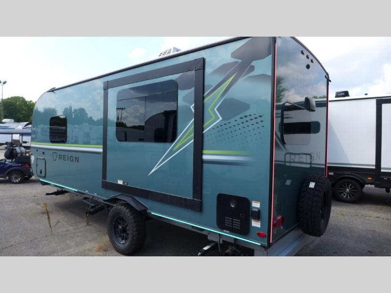 The Reign travel trailers by Keystone are premium single-axle units that are sure to make an impression at the campground. Each one is built with an exclusive automotive-finished aluminum exterior, a walkable roof, and a 100% composite floor for added durability. There are also tinted safety glass windows, quick drop stabilizer jacks, and an exterior shower with hot and cold water. The European inspired interior design is unique and cozy, and the 78" interior height will give you plenty of space to move about. You will also enjoy the ultra bright LED light strip and solid surface countertops in the kitchen, along with blackout night shades, and many more interior comforts.