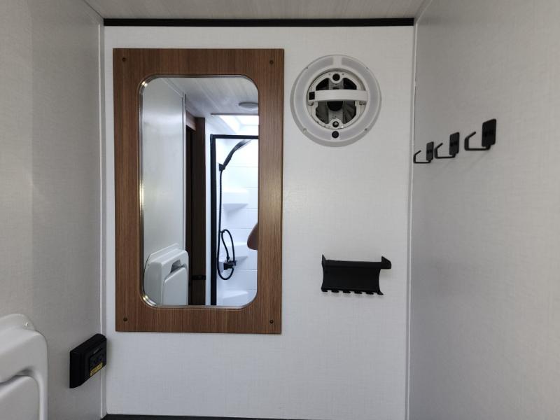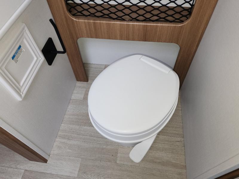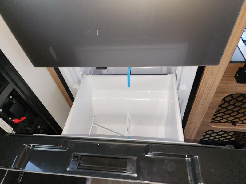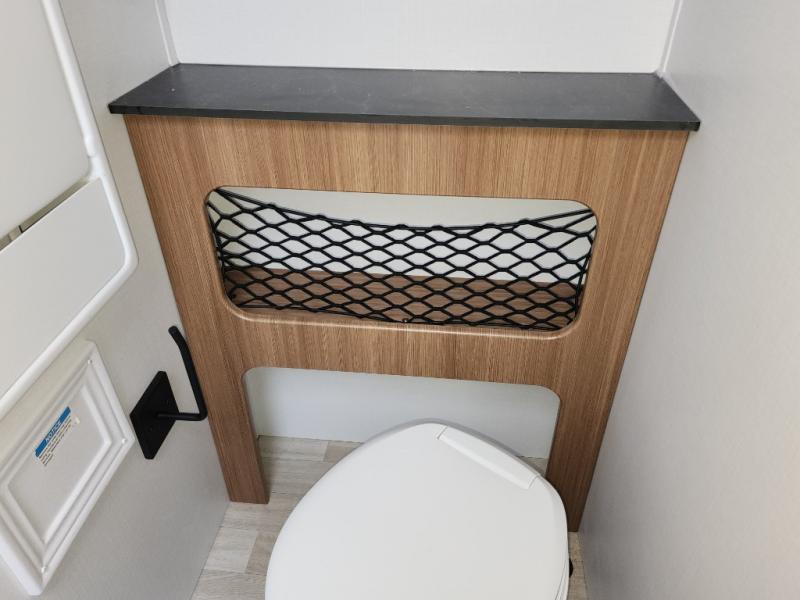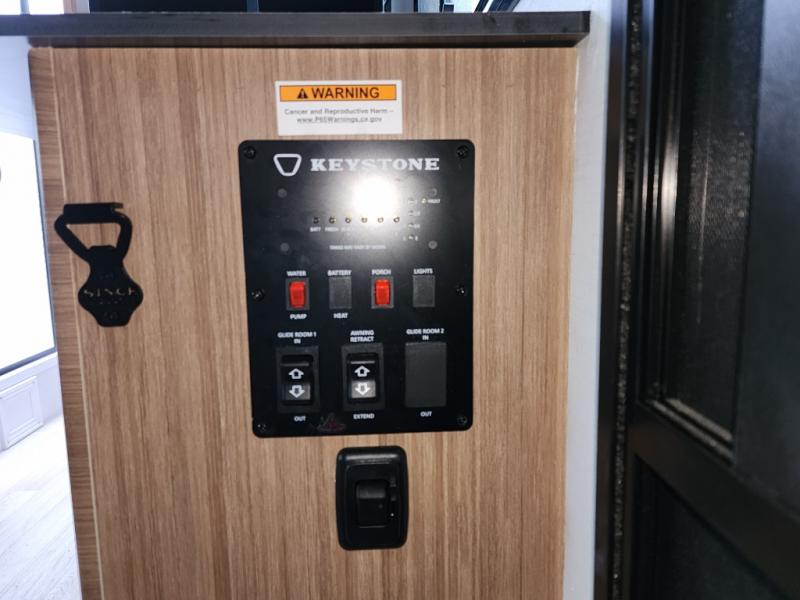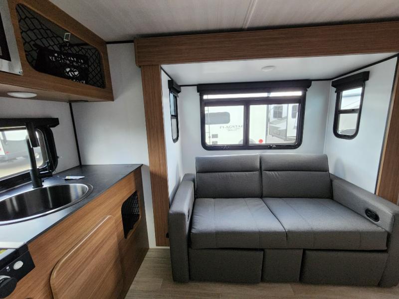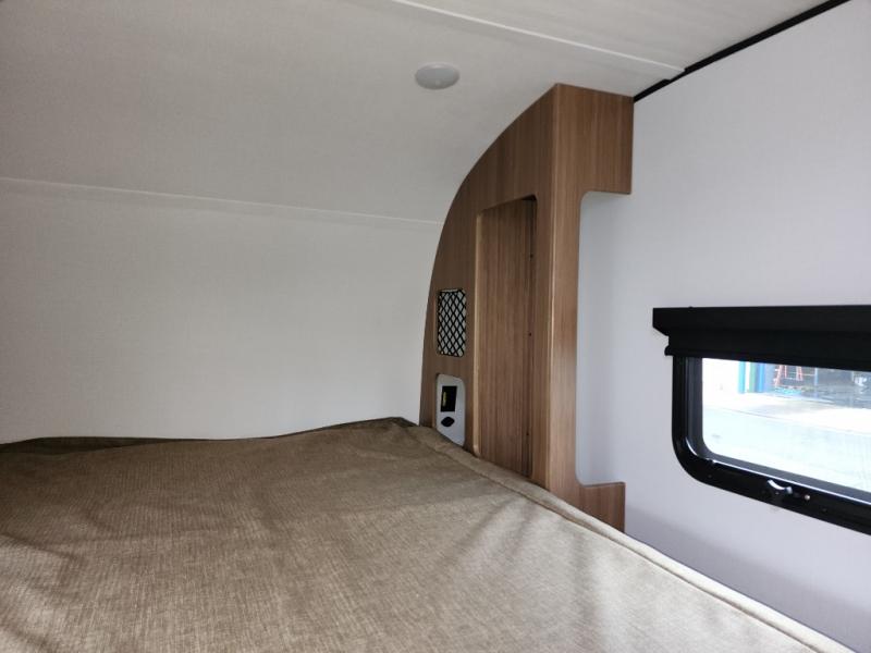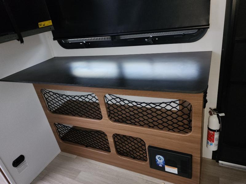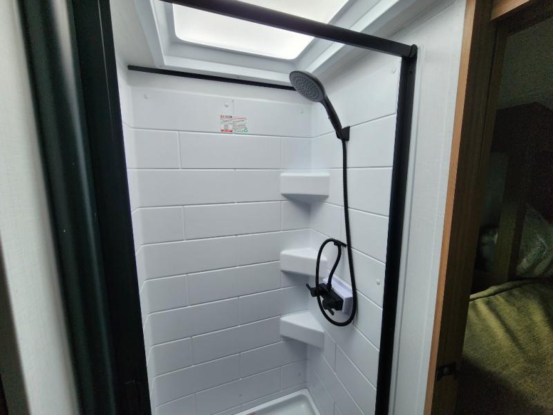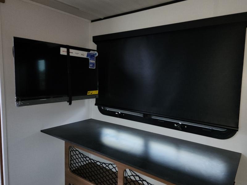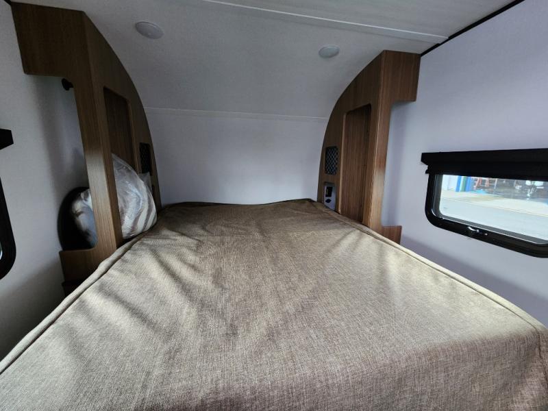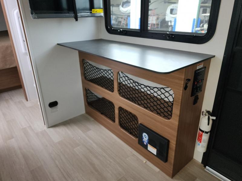 You will love this travel trailer's stunning rear kitchen design! The theater dinette provides a comfortable spot for meals and relaxation, while the bar countertop with stools offers a space for socializing and enjoying drinks. Also, overhead cabinets provide ample storage for your kitchen essentials. In the center of this travel trailer, the walkthrough bathroom features a convenient flip-down sink and linen closet, making it easy to get ready and stay organized. Moreover, the front bedroom is a serene retreat, featuring a spacious 60” x 74” bed with cubbies beside the bed for storing your favorite books, glasses, or other personal items. Plus, a 13' awning provides shade and protection from the elements, creating a comfortable outdoor living space.