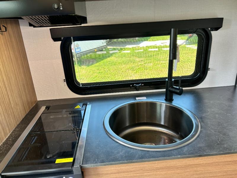 Rear Kitchen Layout — Full countertop prep space, deep-bowl sink, 2-burner cooktop, and pantry storage
