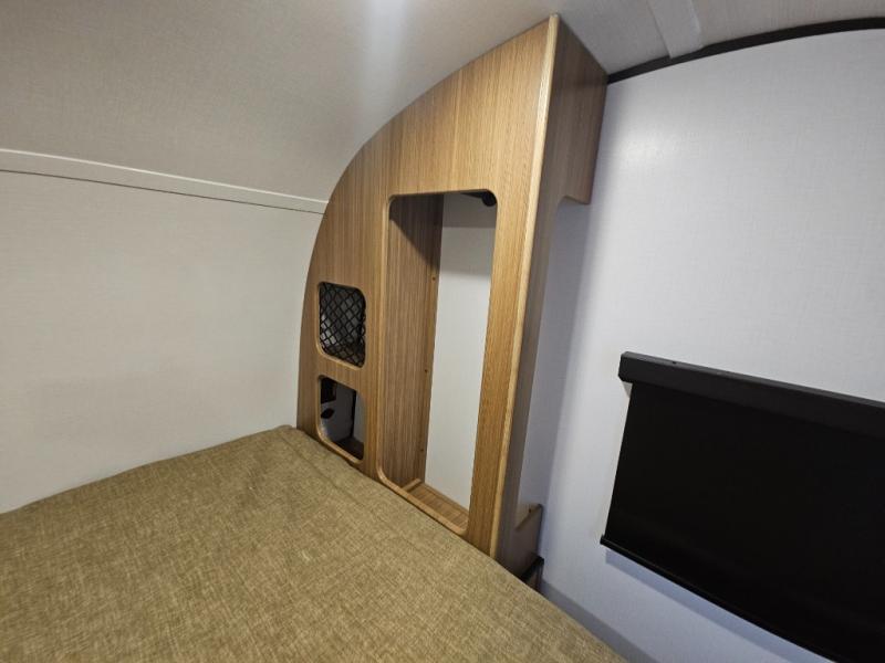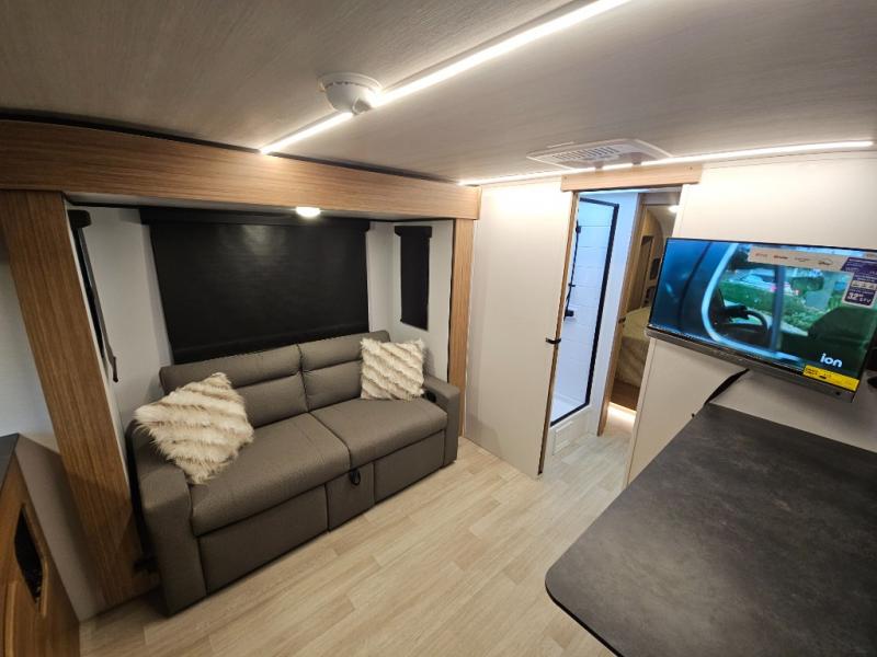 You will love this travel trailer's stunning rear kitchen design! The theater dinette provides a comfortable spot for meals and relaxation, while the bar countertop with stools offers a space for socializing and enjoying drinks. Also, overhead cabinets provide ample storage for your kitchen essentials. In the center of this travel trailer, the walkthrough bathroom features a convenient flip-down sink and linen closet, making it easy to get ready and stay organized. Moreover, the front bedroom is a serene retreat, featuring a spacious 60” x 74” bed with cubbies beside the bed for storing your favorite books, glasses, or other personal items. Plus, a 13' awning provides shade and protection from the elements, creating a comfortable outdoor living space.