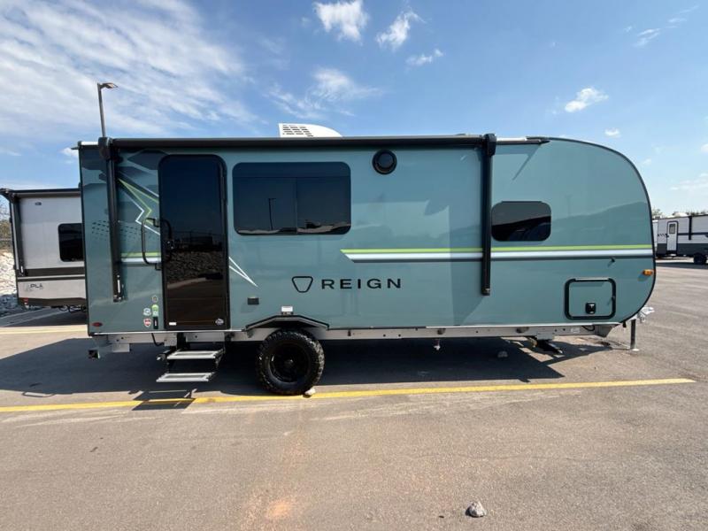 The Reign travel trailers by Keystone are premium single-axle units that are sure to make an impression at the campground. Each one is built with an exclusive automotive-finished aluminum exterior, a walkable roof, and a 100% composite floor for added durability. There are also tinted safety glass windows, quick drop stabilizer jacks, and an exterior shower with hot and cold water. The European inspired interior design is unique and cozy, and the 78" interior height will give you plenty of space to move about. You will also enjoy the ultra bright LED light strip and solid surface countertops in the kitchen, along with blackout night shades, and many more interior comforts.