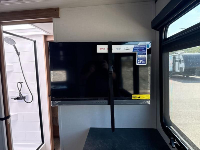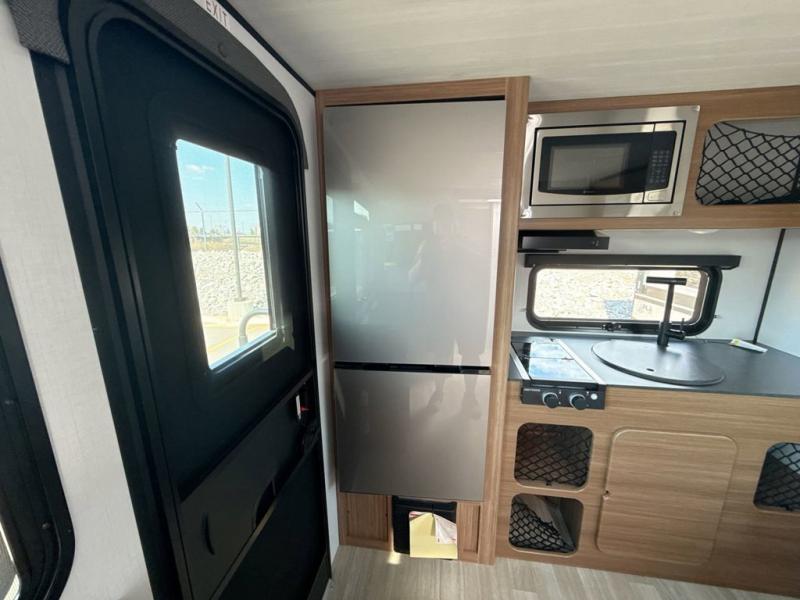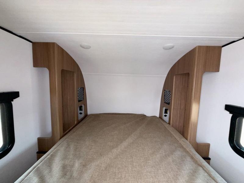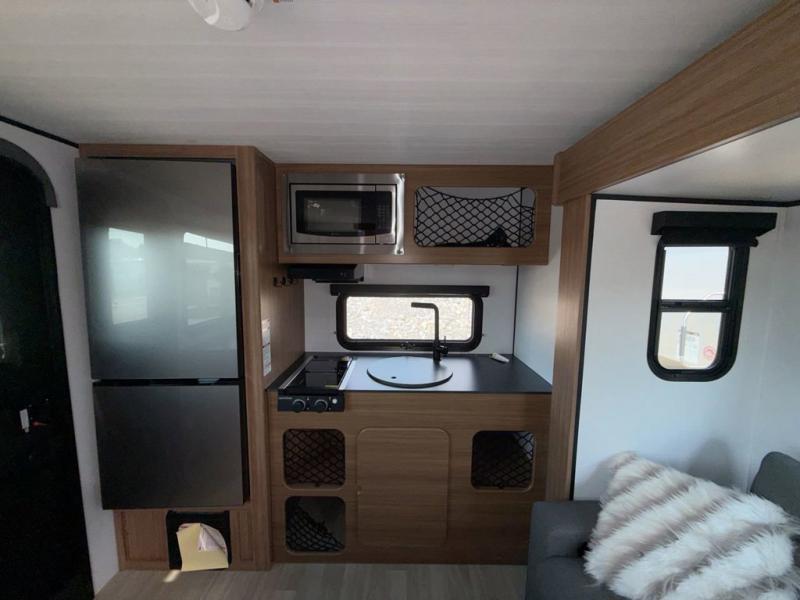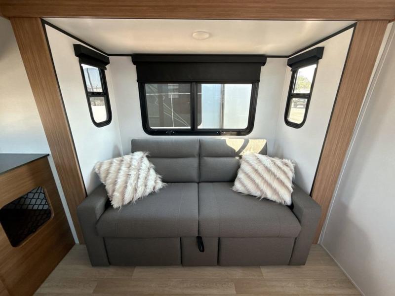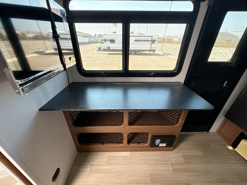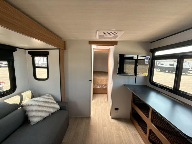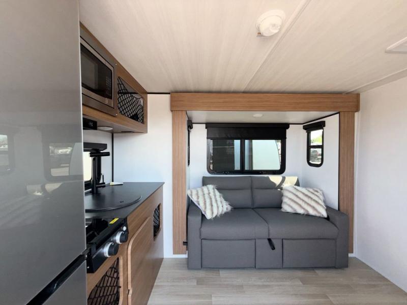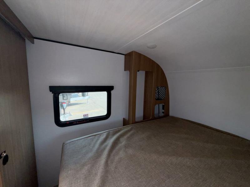 You will love this travel trailer's stunning rear kitchen design! The theater dinette provides a comfortable spot for meals and relaxation, while the bar countertop with stools offers a space for socializing and enjoying drinks. Also, overhead cabinets provide ample storage for your kitchen essentials. In the center of this travel trailer, the walkthrough bathroom features a convenient flip-down sink and linen closet, making it easy to get ready and stay organized. Moreover, the front bedroom is a serene retreat, featuring a spacious 60” x 74” bed with cubbies beside the bed for storing your favorite books, glasses, or other personal items. Plus, a 13' awning provides shade and protection from the elements, creating a comfortable outdoor living space.