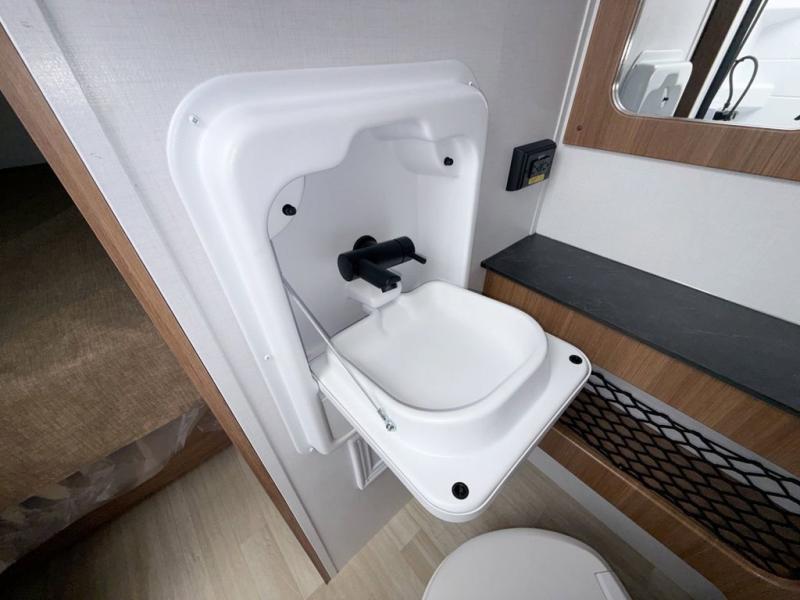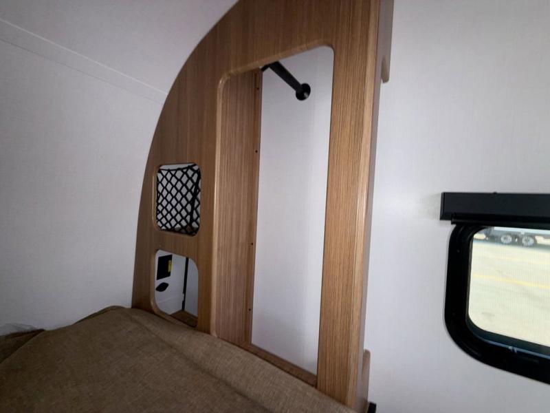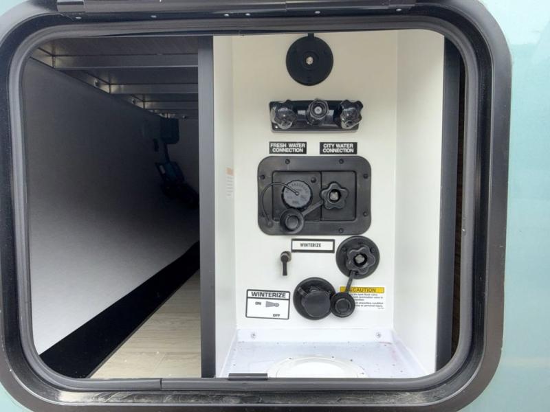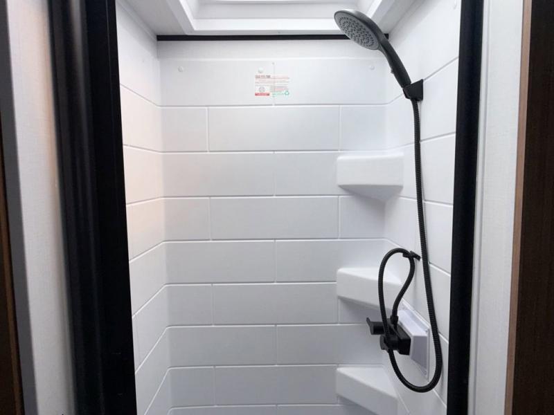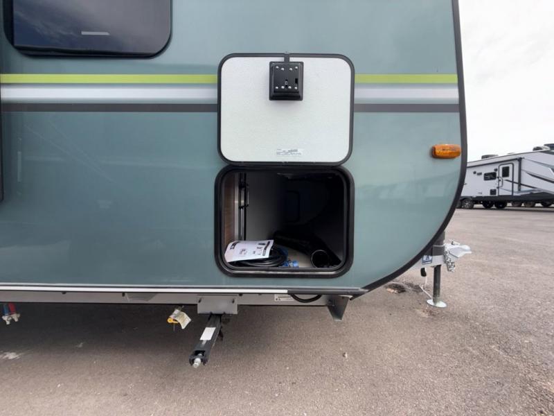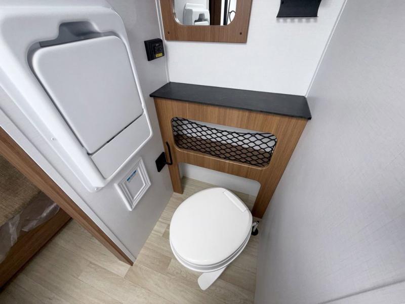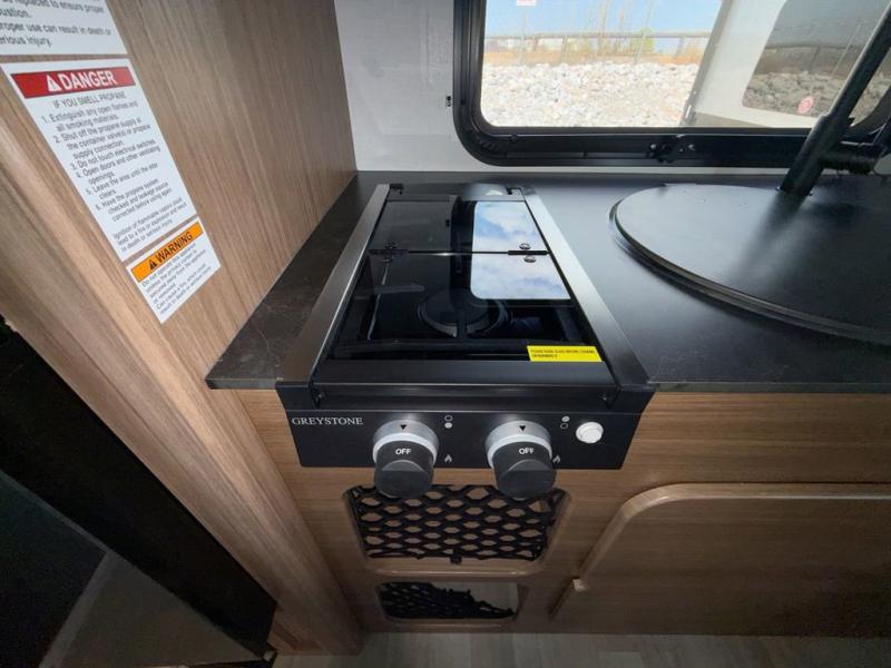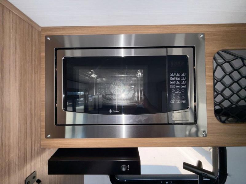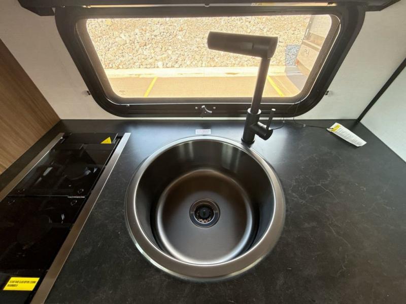 You will love this travel trailer's stunning rear kitchen design! The theater dinette provides a comfortable spot for meals and relaxation, while the bar countertop with stools offers a space for socializing and enjoying drinks. Also, overhead cabinets provide ample storage for your kitchen essentials. In the center of this travel trailer, the walkthrough bathroom features a convenient flip-down sink and linen closet, making it easy to get ready and stay organized. Moreover, the front bedroom is a serene retreat, featuring a spacious 60” x 74” bed with cubbies beside the bed for storing your favorite books, glasses, or other personal items. Plus, a 13' awning provides shade and protection from the elements, creating a comfortable outdoor living space.