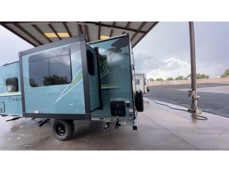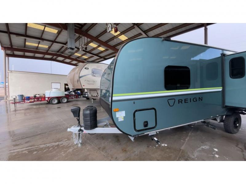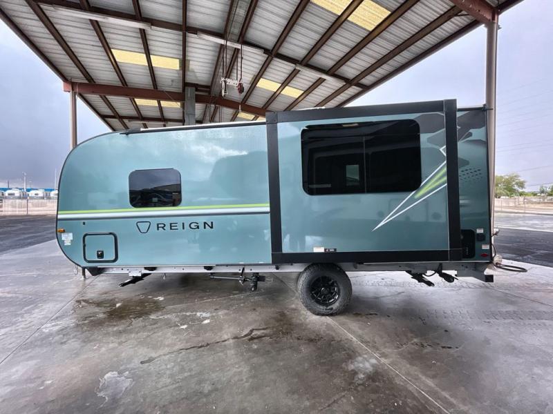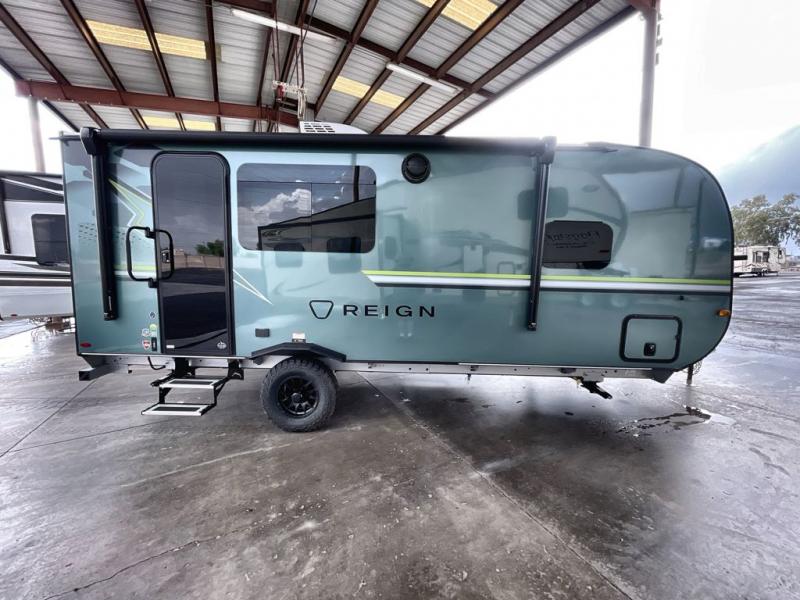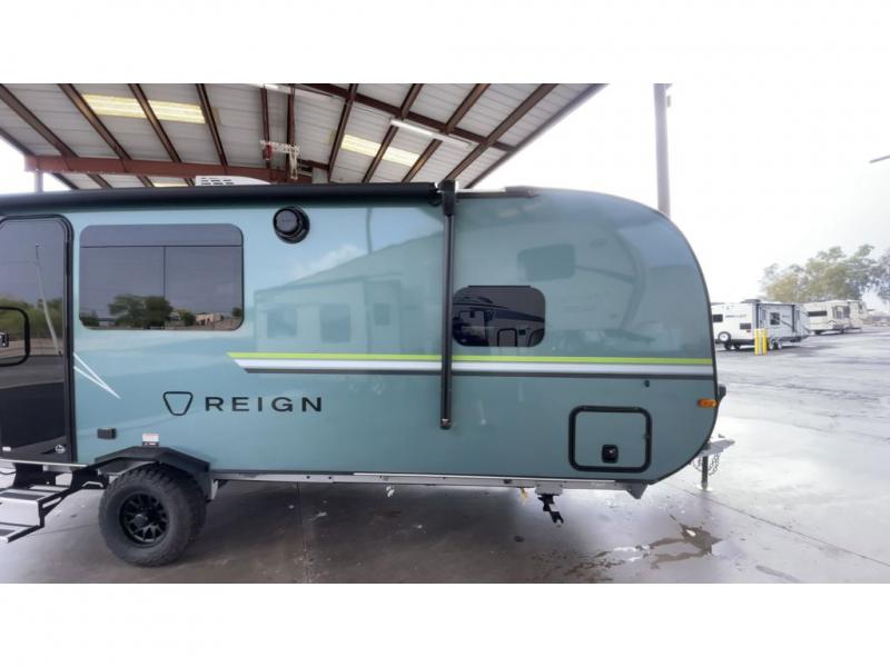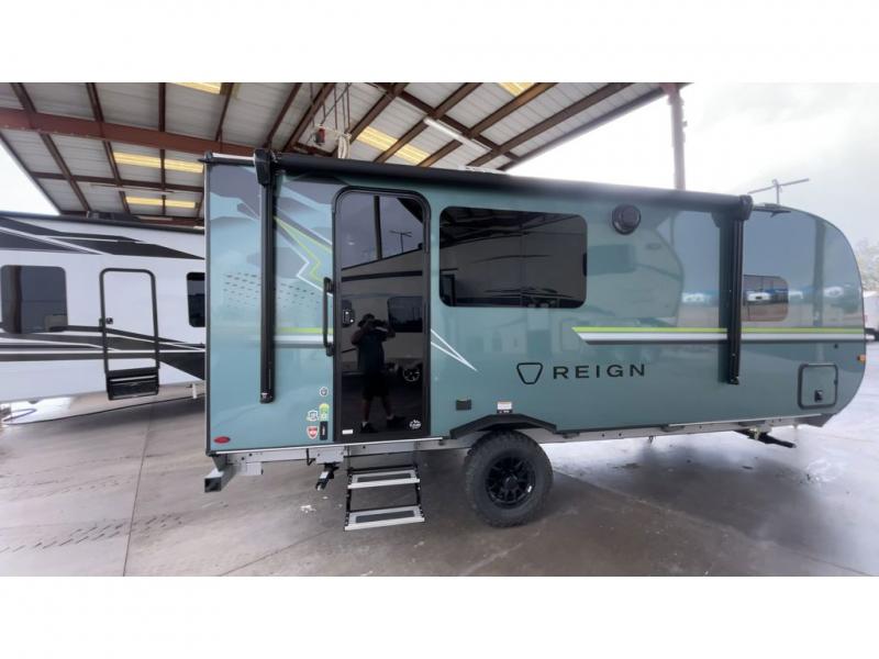 The Reign travel trailers by Keystone are premium single-axle units that are sure to make an impression at the campground. Each one is built with an exclusive automotive-finished aluminum exterior, a walkable roof, and a 100% composite floor for added durability. There are also tinted safety glass windows, quick drop stabilizer jacks, and an exterior shower with hot and cold water. The European inspired interior design is unique and cozy, and the 78" interior height will give you plenty of space to move about. You will also enjoy the ultra bright LED light strip and solid surface countertops in the kitchen, along with blackout night shades, and many more interior comforts.