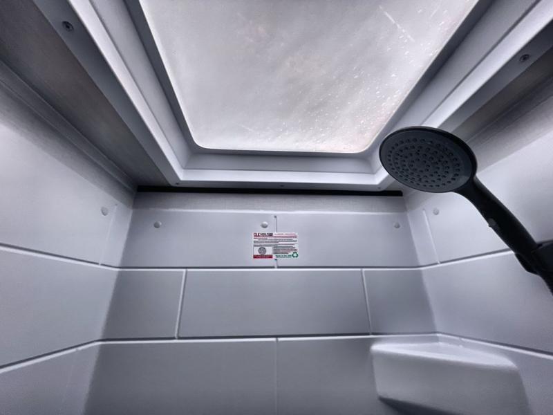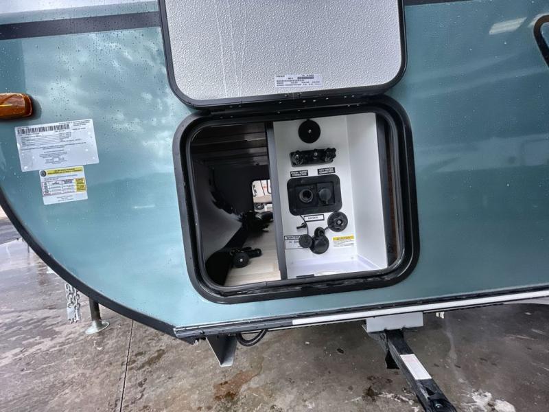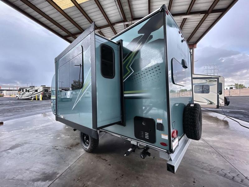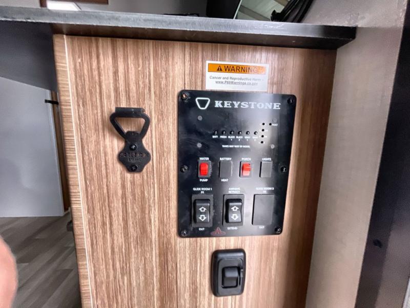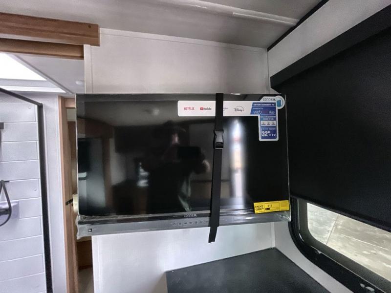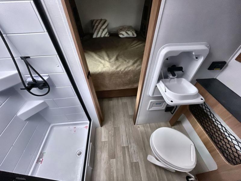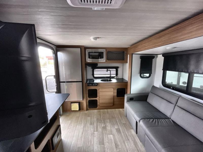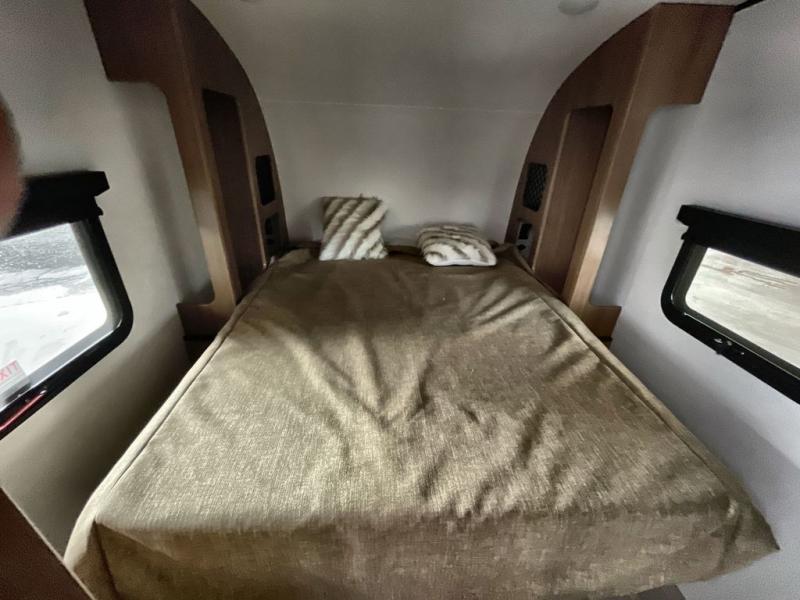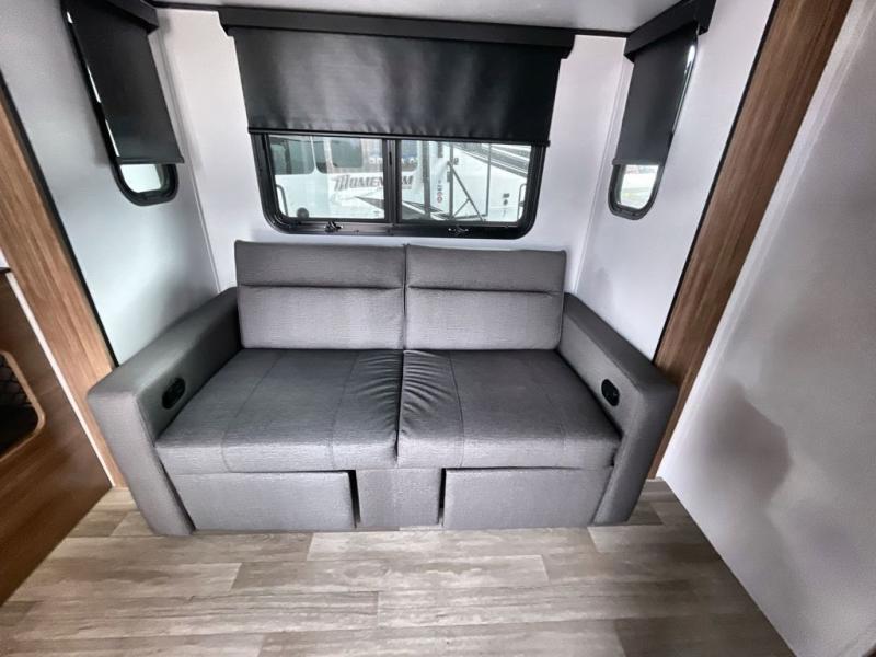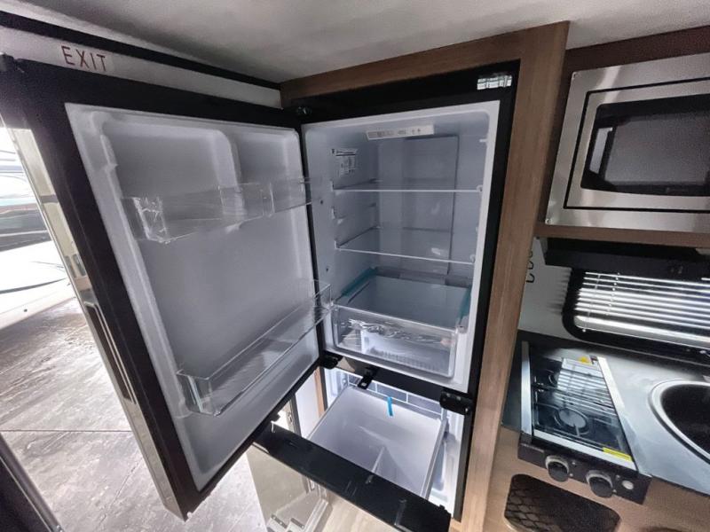 You will love this travel trailer's stunning rear kitchen design! The theater dinette provides a comfortable spot for meals and relaxation, while the bar countertop with stools offers a space for socializing and enjoying drinks. Also, overhead cabinets provide ample storage for your kitchen essentials. In the center of this travel trailer, the walkthrough bathroom features a convenient flip-down sink and linen closet, making it easy to get ready and stay organized. Moreover, the front bedroom is a serene retreat, featuring a spacious 60” x 74” bed with cubbies beside the bed for storing your favorite books, glasses, or other personal items. Plus, a 13' awning provides shade and protection from the elements, creating a comfortable outdoor living space.