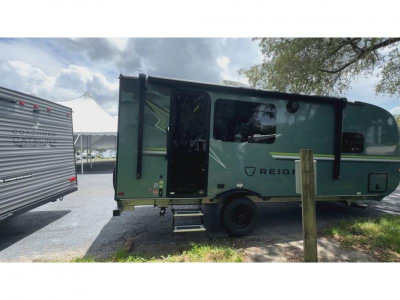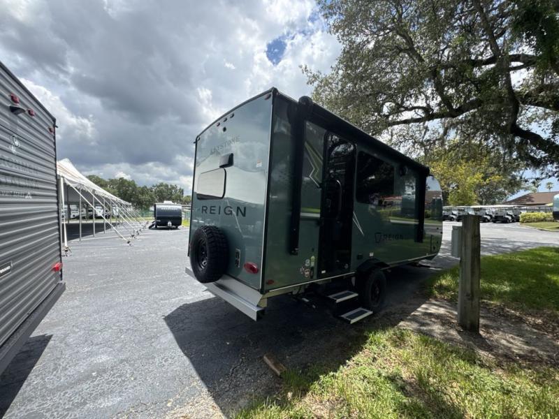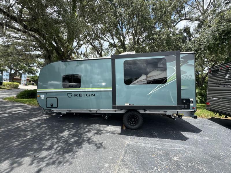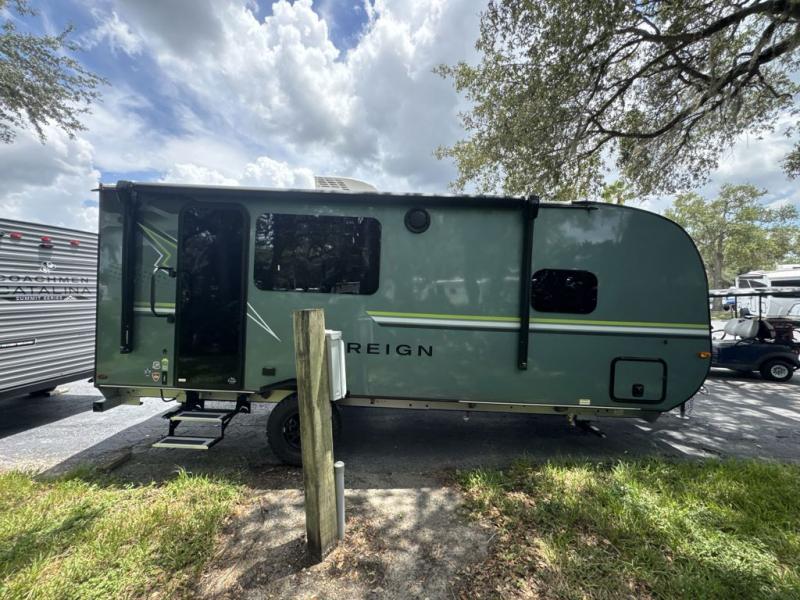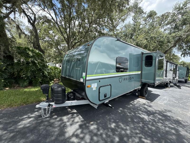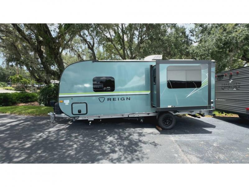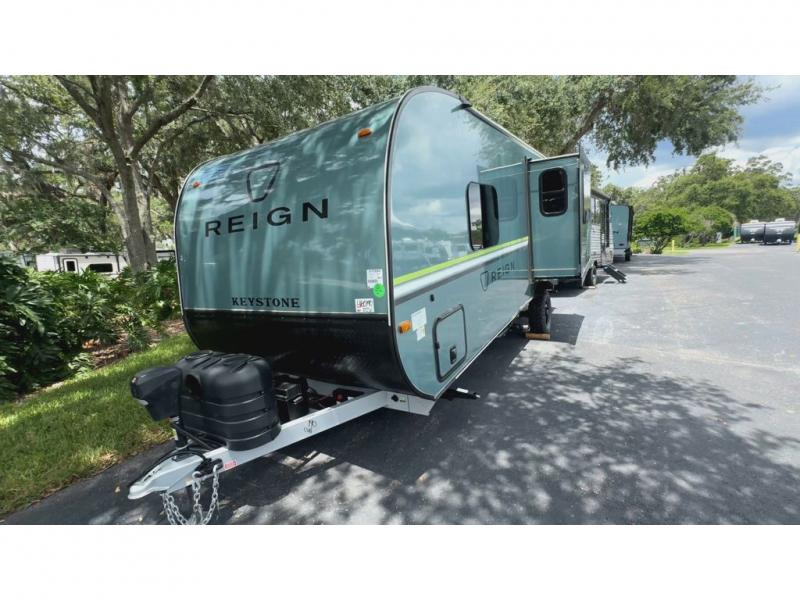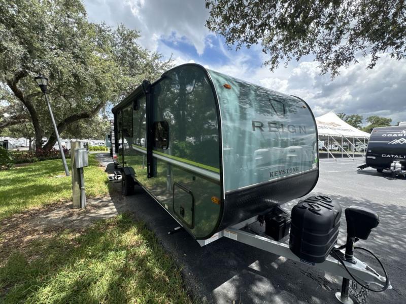 The Reign travel trailers by Keystone are premium single-axle units that are sure to make an impression at the campground. Each one is built with an exclusive automotive-finished aluminum exterior, a walkable roof, and a 100% composite floor for added durability. There are also tinted safety glass windows, quick drop stabilizer jacks, and an exterior shower with hot and cold water. The European inspired interior design is unique and cozy, and the 78" interior height will give you plenty of space to move about. You will also enjoy the ultra bright LED light strip and solid surface countertops in the kitchen, along with blackout night shades, and many more interior comforts.