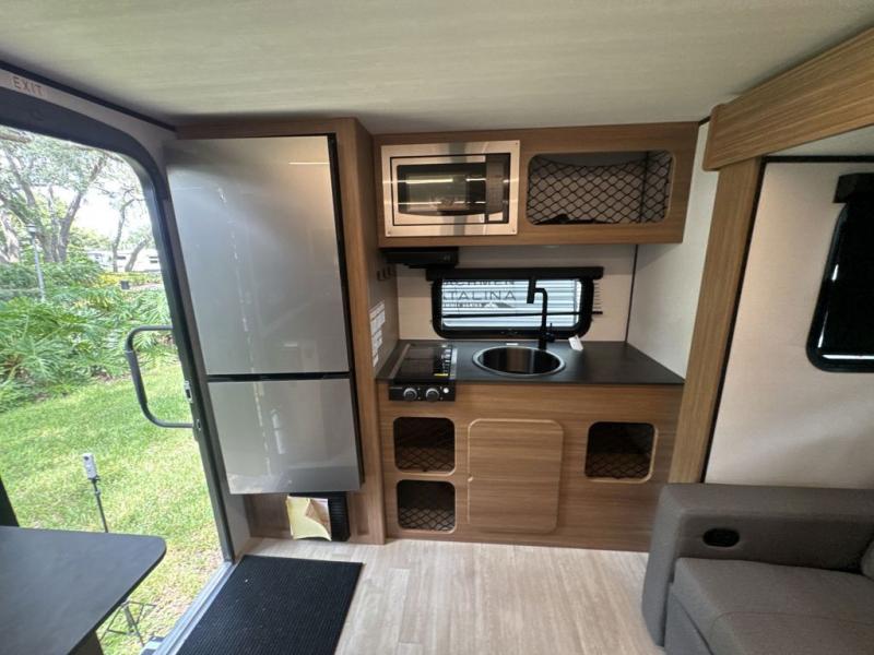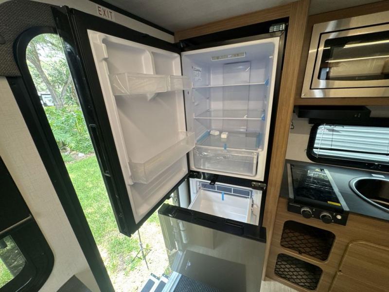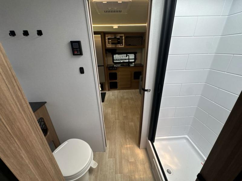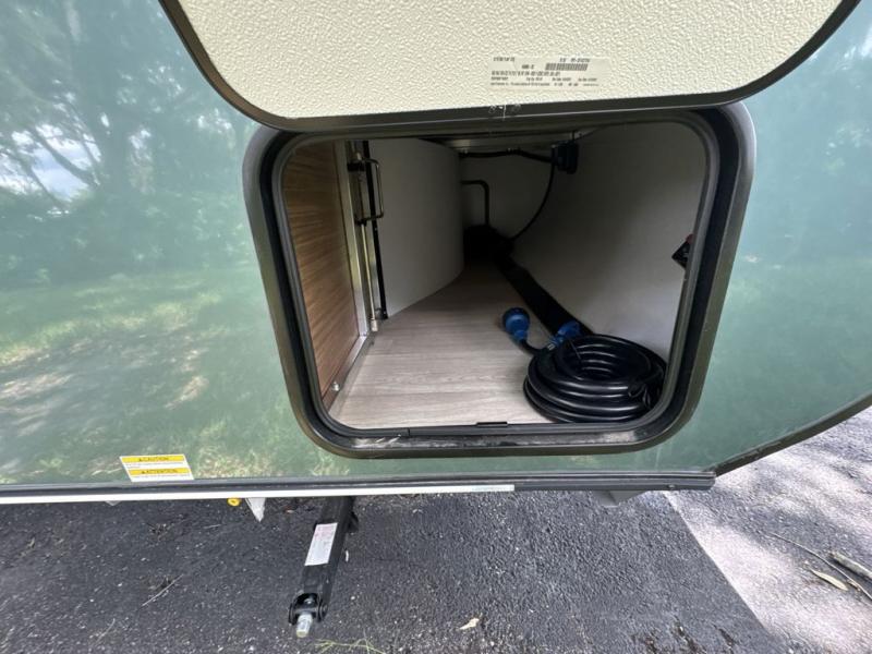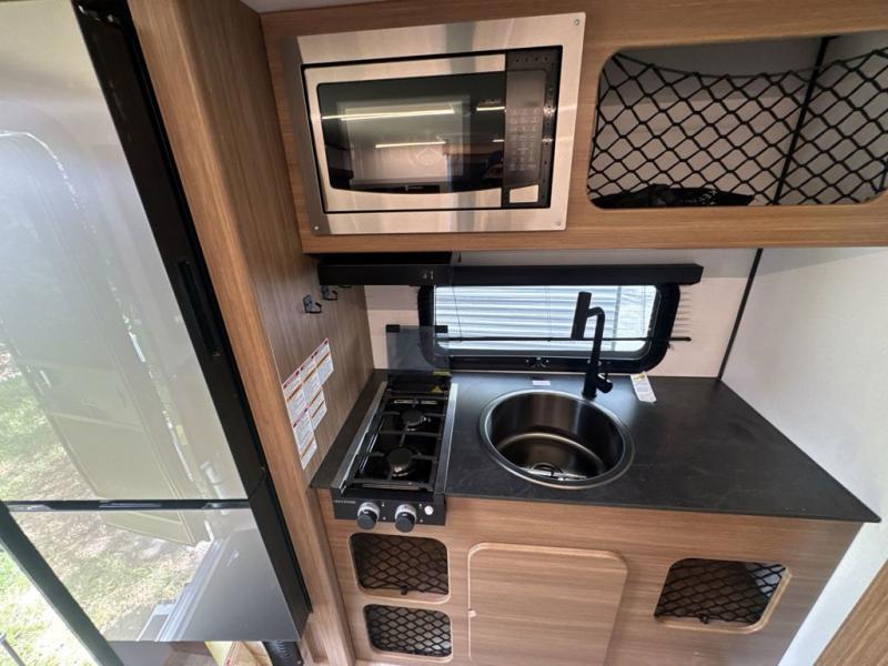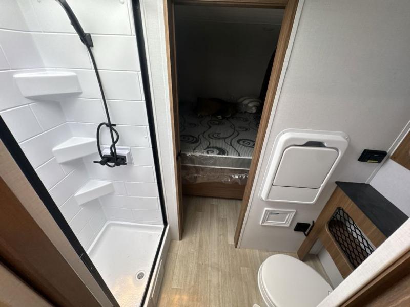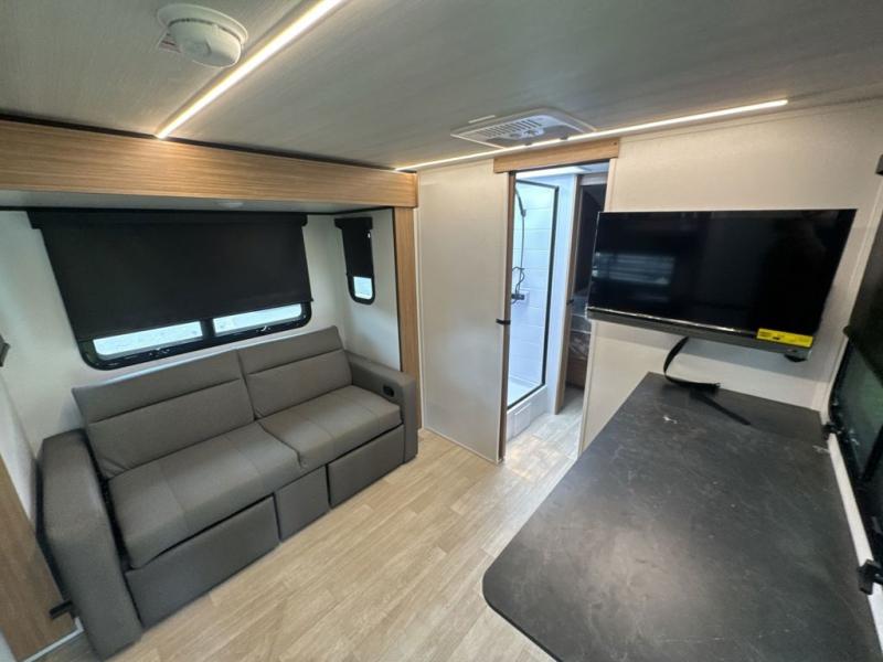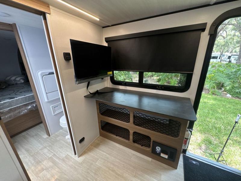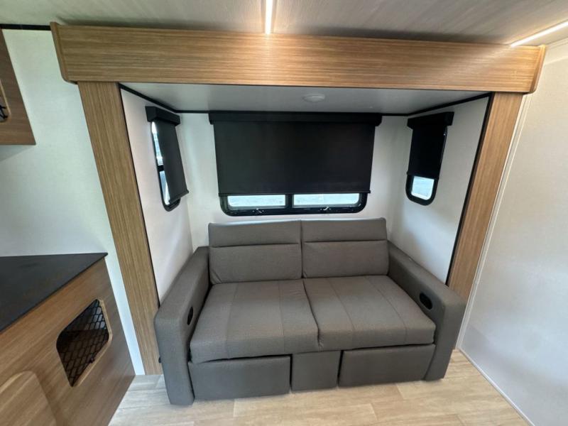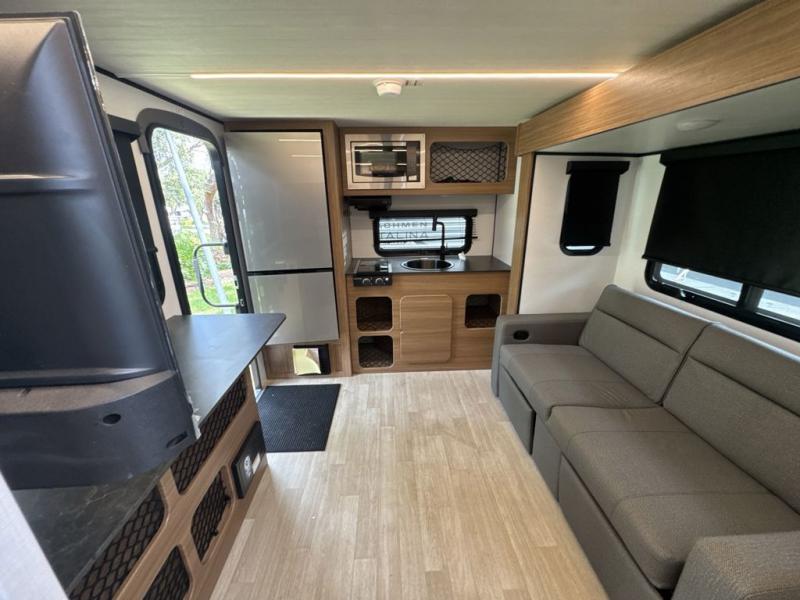 You will love this travel trailer's stunning rear kitchen design! The theater dinette provides a comfortable spot for meals and relaxation, while the bar countertop with stools offers a space for socializing and enjoying drinks. Also, overhead cabinets provide ample storage for your kitchen essentials. In the center of this travel trailer, the walkthrough bathroom features a convenient flip-down sink and linen closet, making it easy to get ready and stay organized. Moreover, the front bedroom is a serene retreat, featuring a spacious 60” x 74” bed with cubbies beside the bed for storing your favorite books, glasses, or other personal items. Plus, a 13' awning provides shade and protection from the elements, creating a comfortable outdoor living space.