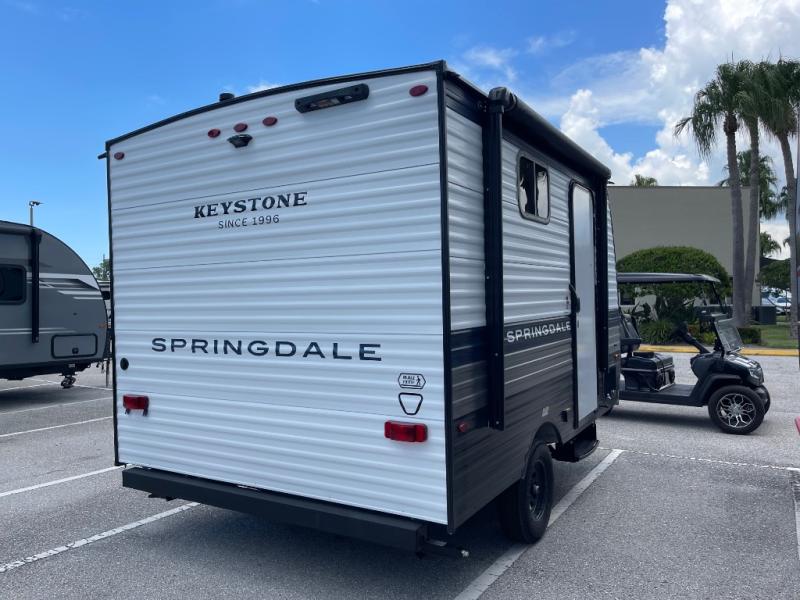 With any Springdale Mini travel trailer by Keystone, you will enjoy lightweight towing thanks to their single-axle! The AlphaPly TPO roof membrane is ultra durable, and the power awning will provide protection from the sun as you relax in your camp chairs outside. Each model includes blackout night shades, LED lighting, plus many more interior comforts. There is also a roof A/C and 20K BTU furnace to keep you comfortable, plus a tankless water heater for endless hot showers!