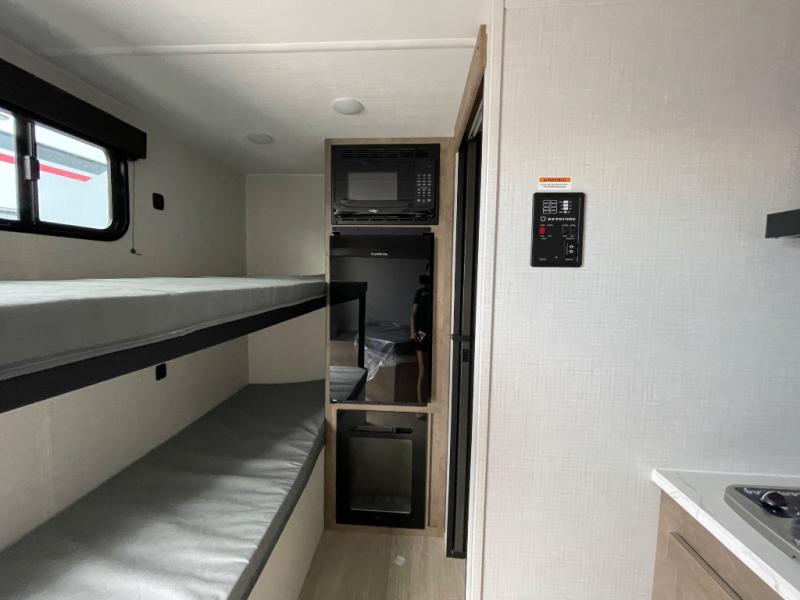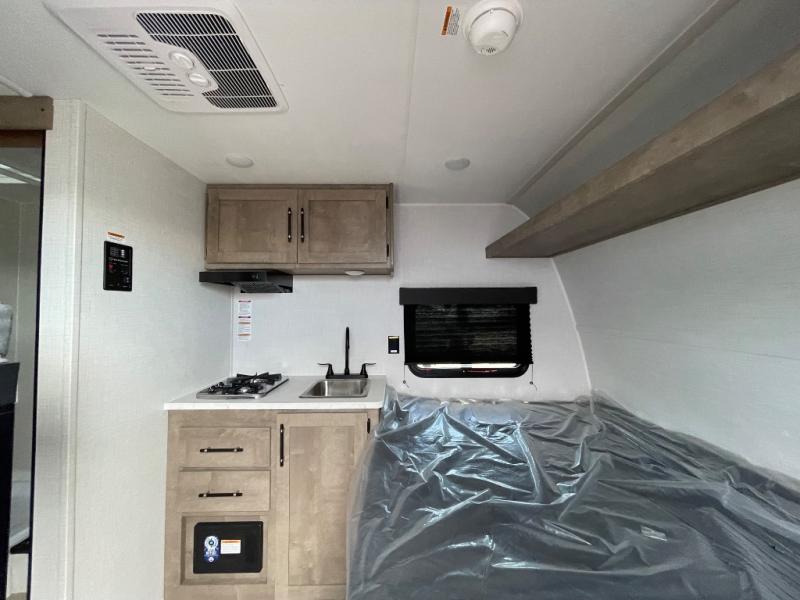 Your small crew will love camping in this lightweight travel trailer. There is a full-size bed up front with a folding bunk above plus a closet at the foot of the bed to keep your things out of the way. The two burner gas cooktop and microwave oven will let you make breakfast in the morning, and the folding table with two chairs provides a place to dine together. And a private bath with a shower and toilet lets you easily clean up after a day outdoors!
