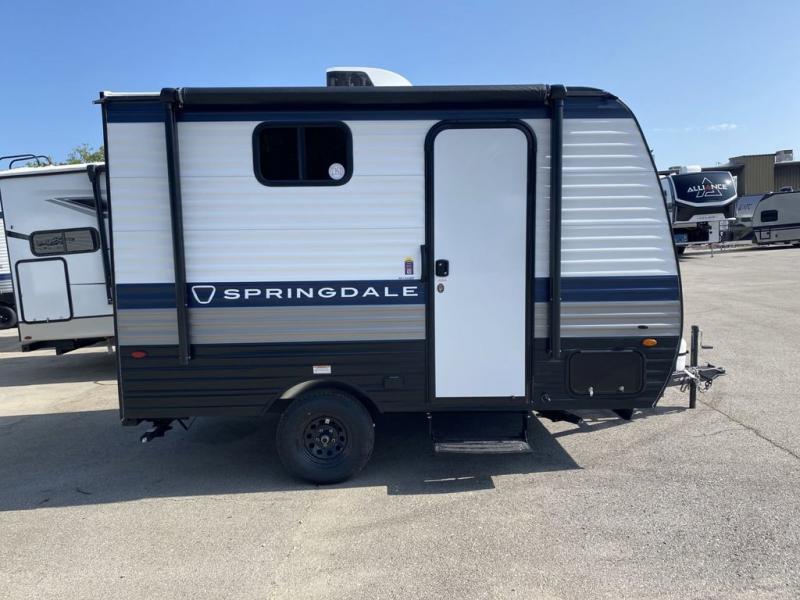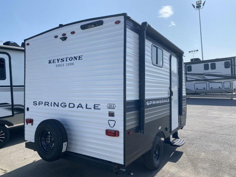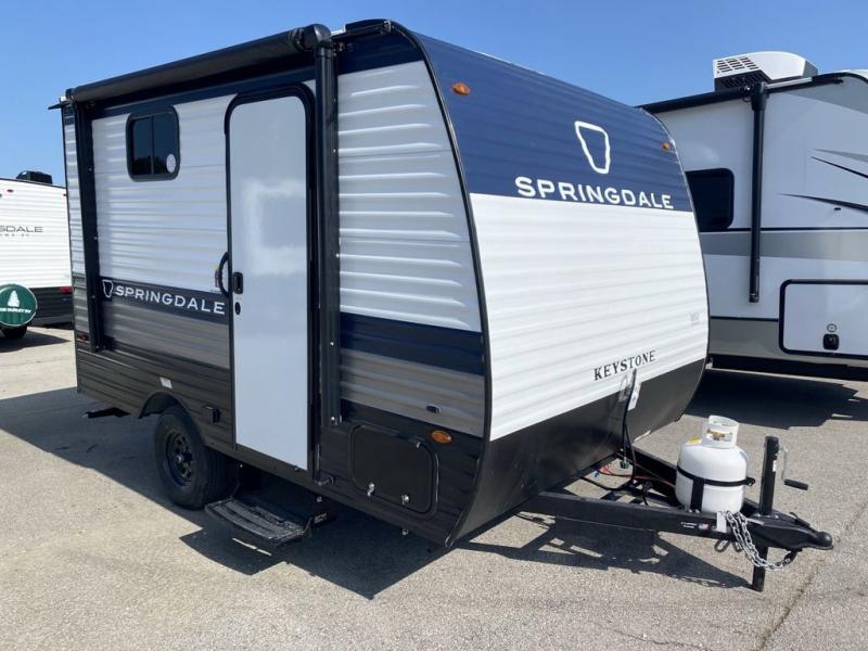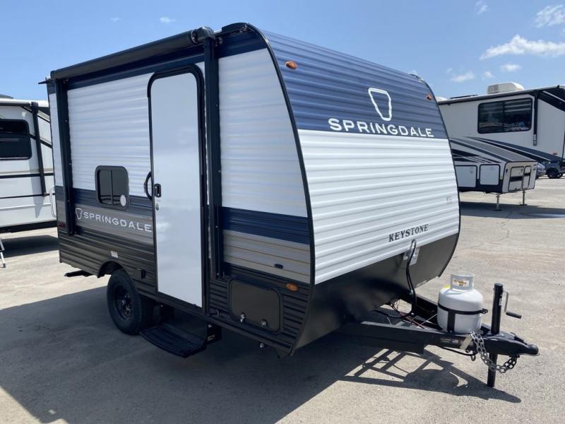 With any Springdale Classic Mini travel trailer by Keystone, you will enjoy lightweight towing thanks to their single-axle! The AlphaPly TPO roof membrane is ultra durable, and the power awning will provide protection from the sun as you relax in your camp chairs outside. Each model includes blackout night shades, LED lighting, plus many more interior comforts. There is also a roof A/C and 20K BTU furnace to keep you comfortable, plus a tankless water heater for endless hot showers!