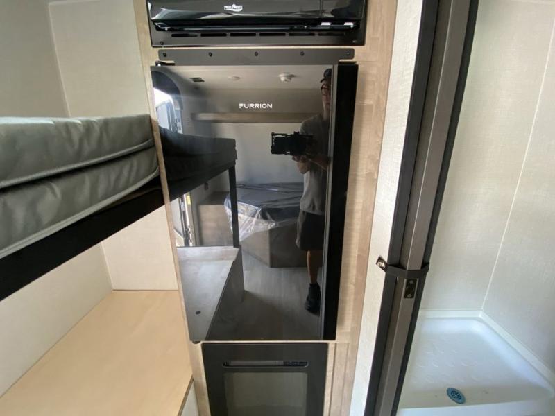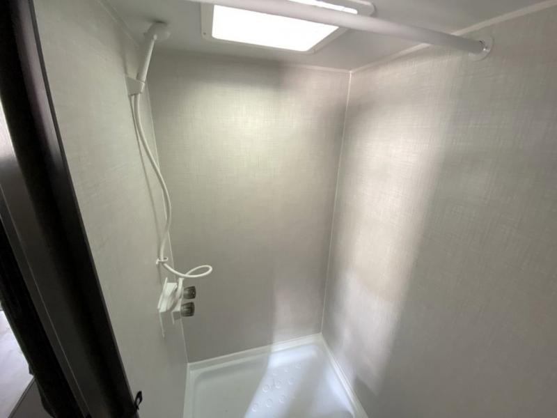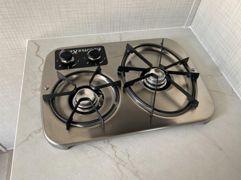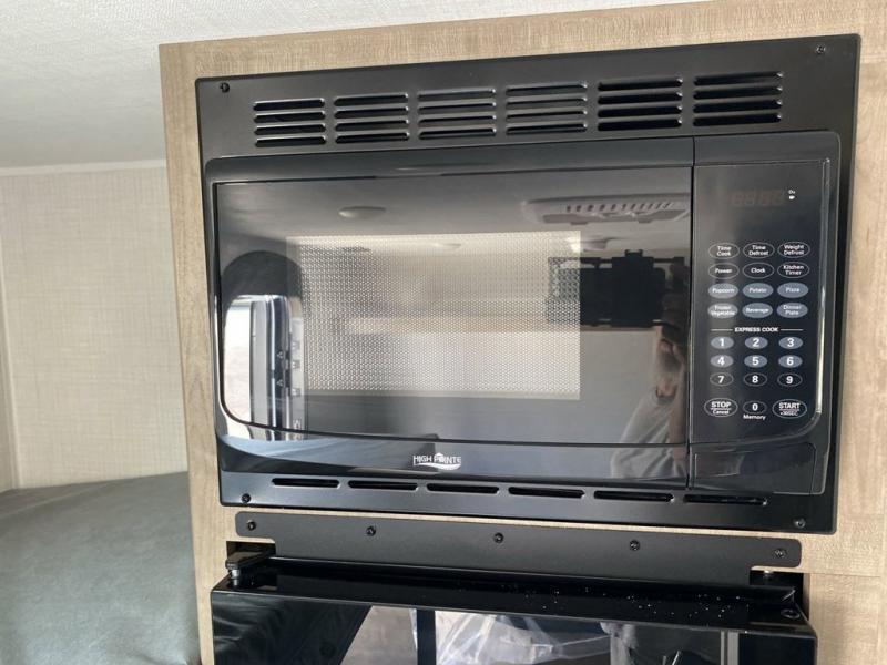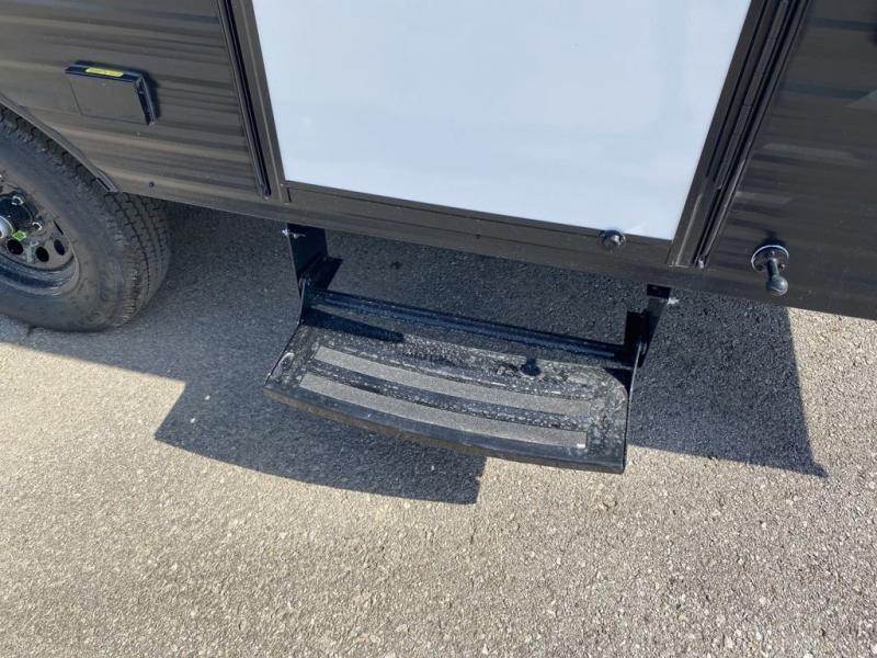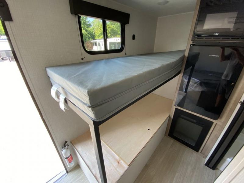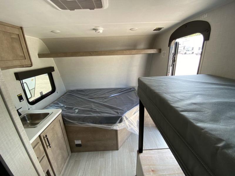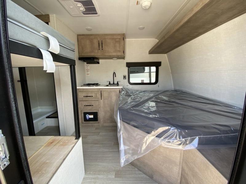This lightweight travel trailer is perfect for four happy campers. You'll enjoy the front full-size bed, while your guests or little ones take the 28" x 74" bunk beds. There is also a shelf above the bed to keep your things organized. A private bath includes a shower with a toilet so you can freshen up each day without having to leave your camper. You can make your meals on the two burner gas cooktop or in the microwave oven, then take your plate outdoors to eat under the 8' power awning!