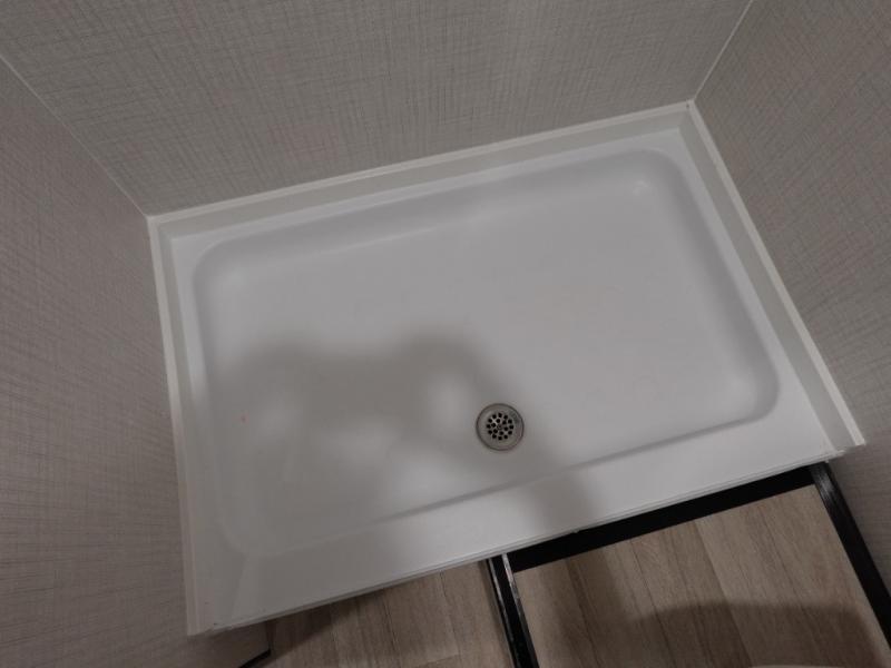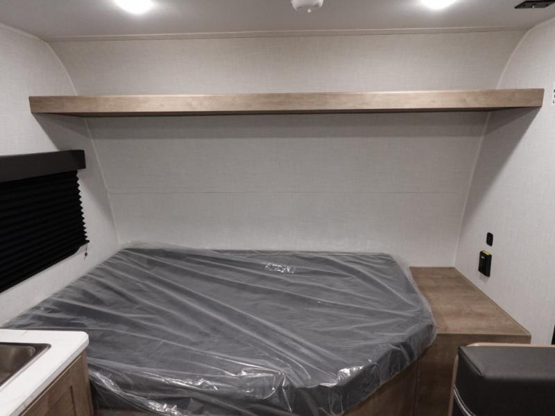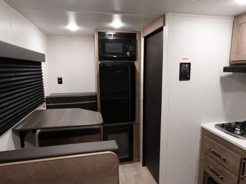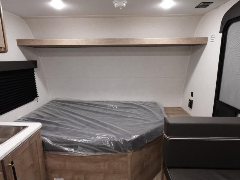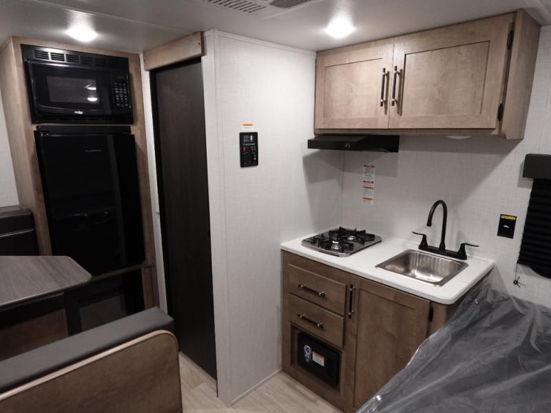 This lightweight travel trailer is perfect for three happy campers. You'll enjoy the front full-size bed, while your guest or little ones take the booth dinette when it's not being used to dine at. There is also a shelf above the bed to keep your things organized. A private bath includes a shower with a toilet so you can freshen up each day without having to leave your camper. You can make your meals on the two burner gas cooktop or in the microwave oven, then take your plate outdoors to eat under the 8' power awning!