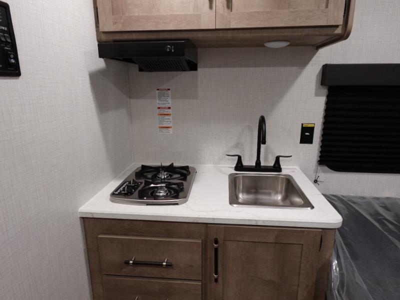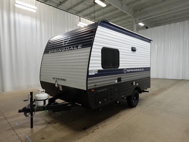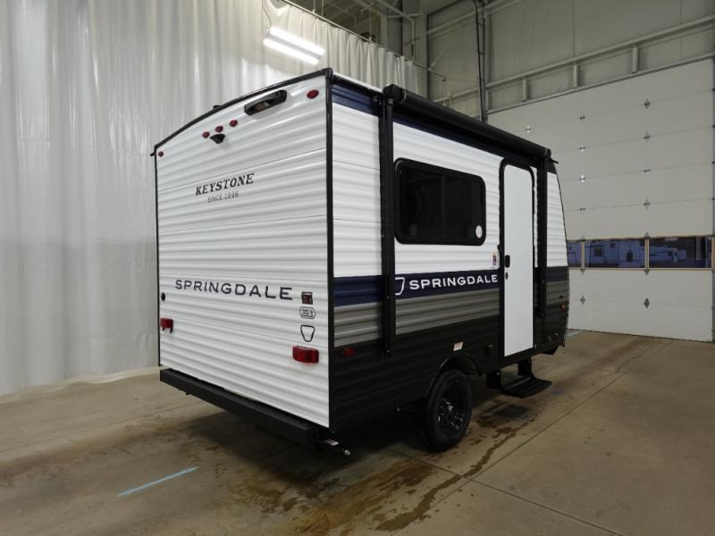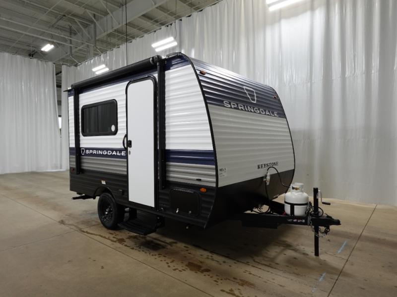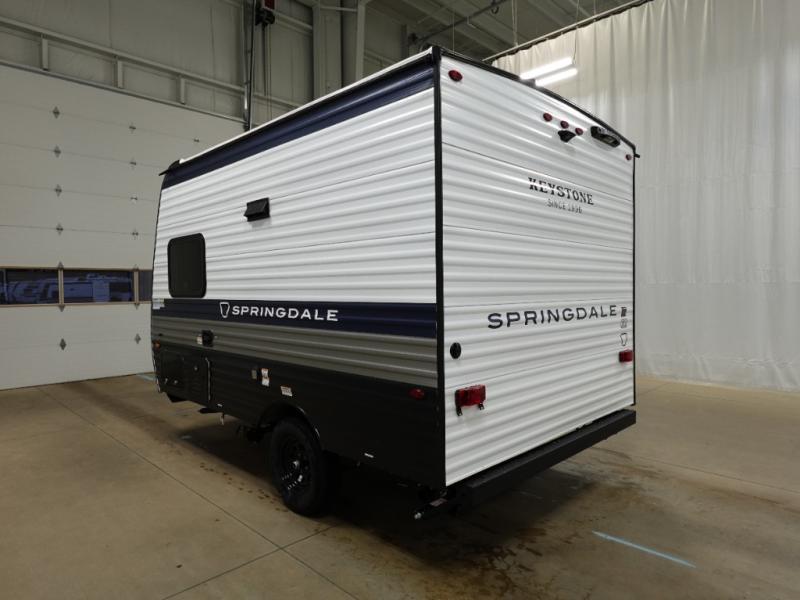 With any Springdale Mini travel trailer by Keystone, you will enjoy lightweight towing thanks to their single-axle! The AlphaPly TPO roof membrane is ultra durable, and the power awning will provide protection from the sun as you relax in your camp chairs outside. Each model includes blackout night shades, LED lighting, plus many more interior comforts. There is also a roof A/C and 20K BTU furnace to keep you comfortable, plus a tankless water heater for endless hot showers!