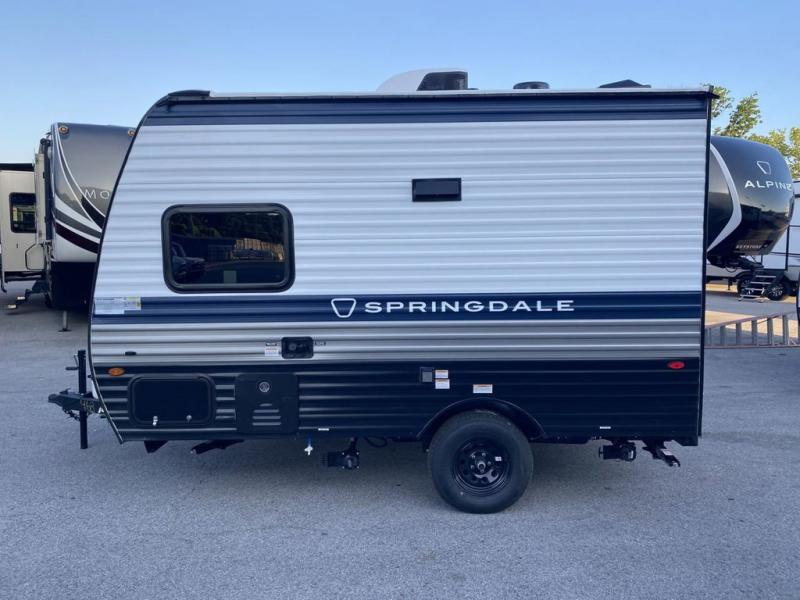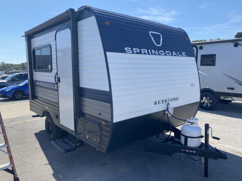 With any Springdale Mini travel trailer by Keystone, you will enjoy lightweight towing thanks to their single-axle! The AlphaPly TPO roof membrane is ultra durable, and the power awning will provide protection from the sun as you relax in your camp chairs outside. Each model includes blackout night shades, LED lighting, plus many more interior comforts. There is also a roof A/C and 20K BTU furnace to keep you comfortable, plus a tankless water heater for endless hot showers!