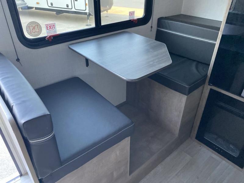 This lightweight travel trailer is perfect for three happy campers. You'll enjoy the front full-size bed, while your guest or little ones take the booth dinette when it's not being used to dine at. There is also a shelf above the bed to keep your things organized. A private bath includes a shower with a toilet so you can freshen up each day without having to leave your camper. You can make your meals on the two burner gas cooktop or in the microwave oven, then take your plate outdoors to eat under the 8' power awning!