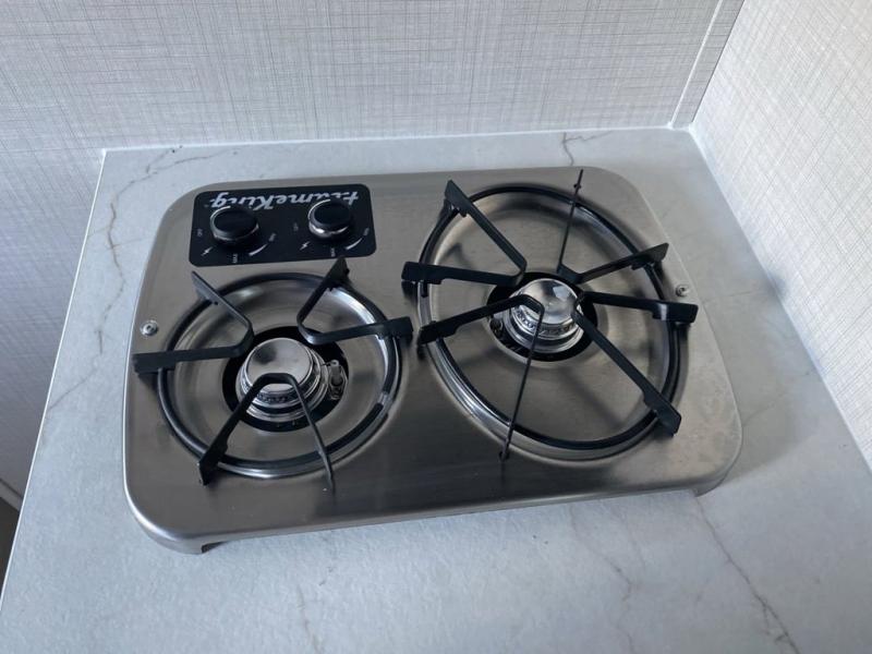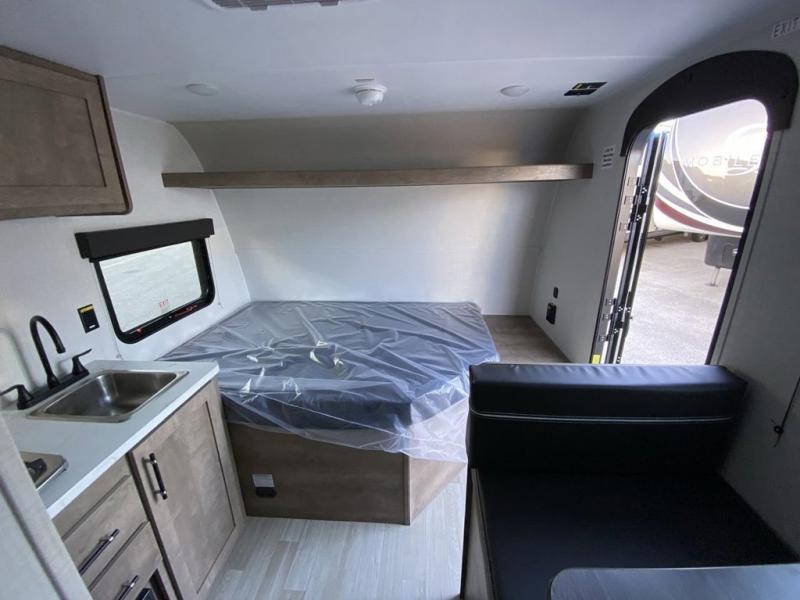 This lightweight travel trailer is perfect for three happy campers. You'll enjoy the front full-size bed, while your guest or little ones take the booth dinette when it's not being used to dine at. There is also a shelf above the bed to keep your things organized. A private bath includes a shower with a toilet so you can freshen up each day without having to leave your camper. You can make your meals on the two burner gas cooktop or in the microwave oven, then take your plate outdoors to eat under the 8' power awning!