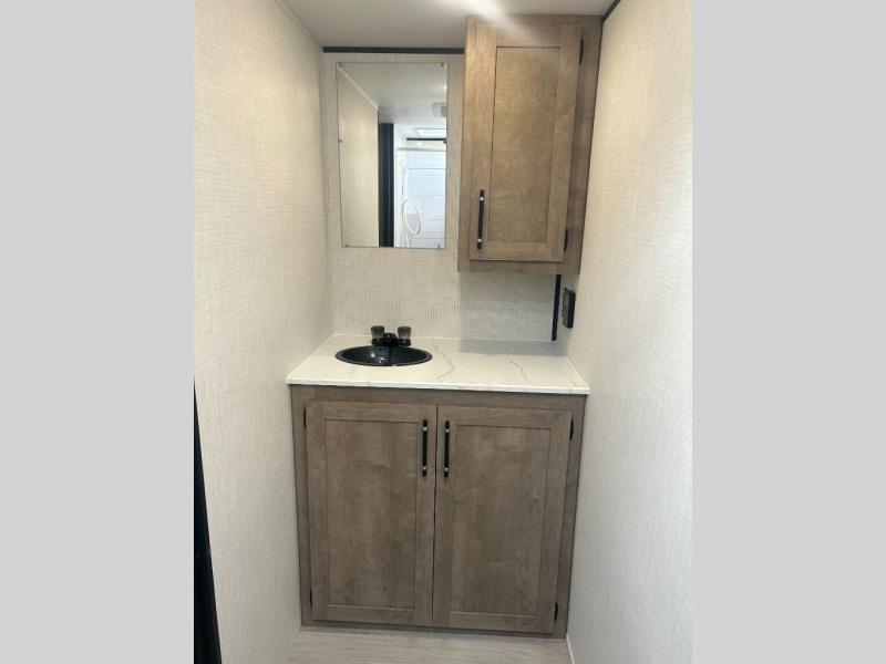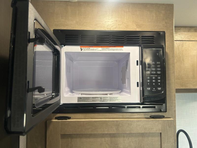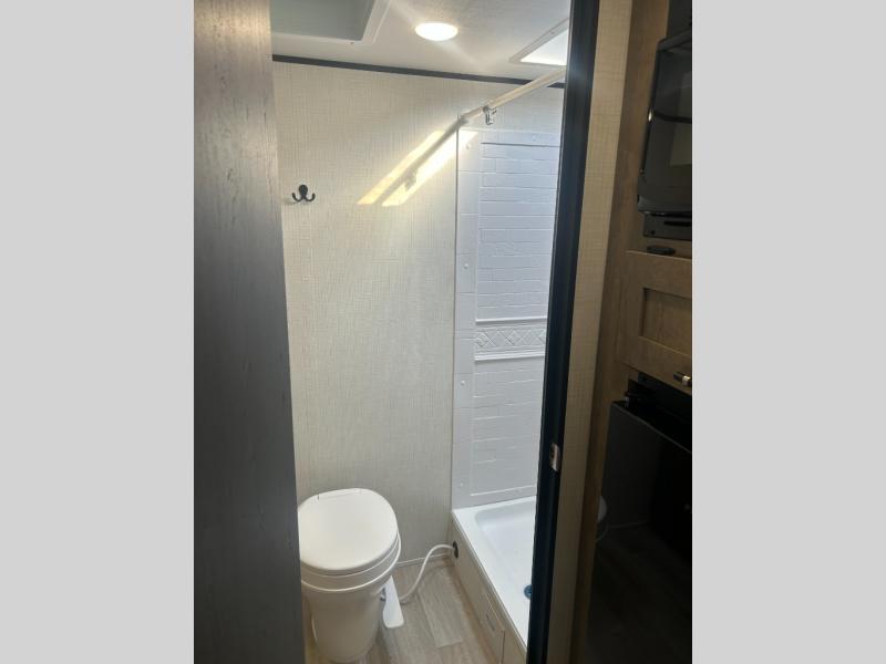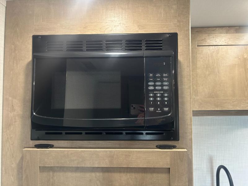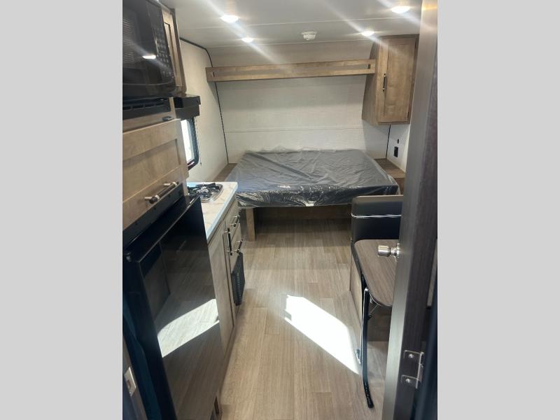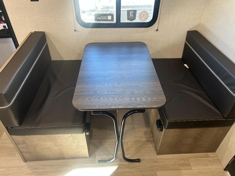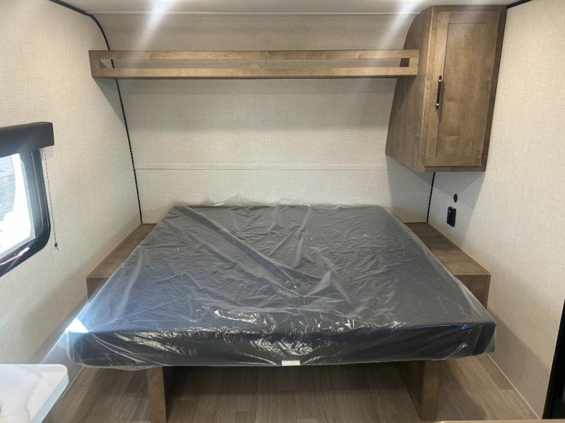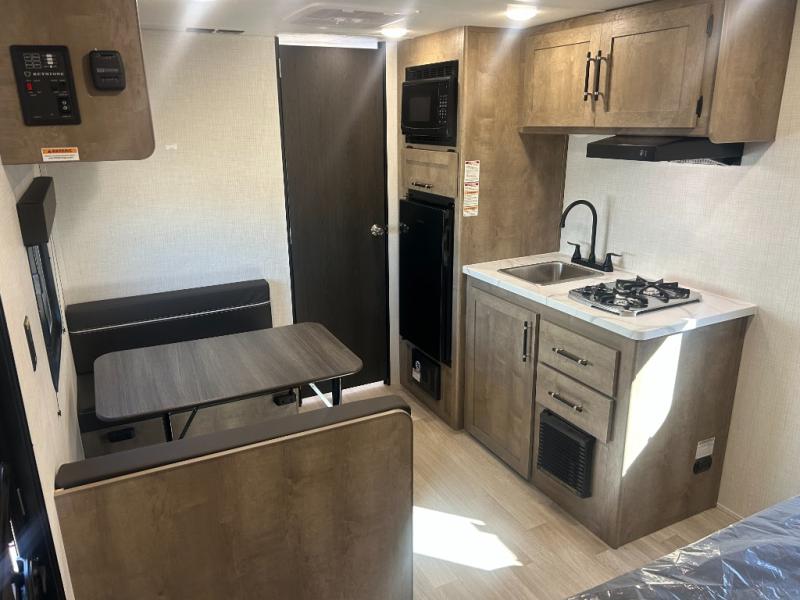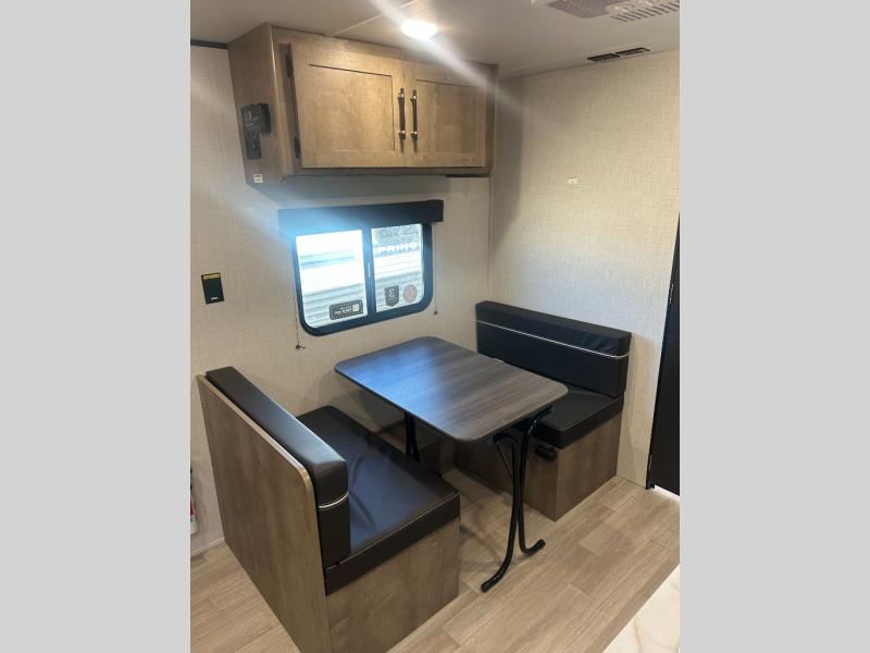 Camping trips just got easier travel trailer that can sleep three to four each night! There is a front Olympic RV queen bed with an overhead shelf and bedside wardrobe for your things. A two-burner cooktop and microwave oven will let you make breakfast for your crew, and a booth dinette provides a place to dine together, as well as convert to sleeping space for a guest or two little ones. This travel trailer also includes a full rear bath, complete with a shower, toilet, and vanity with a sink and overhead cabinet!