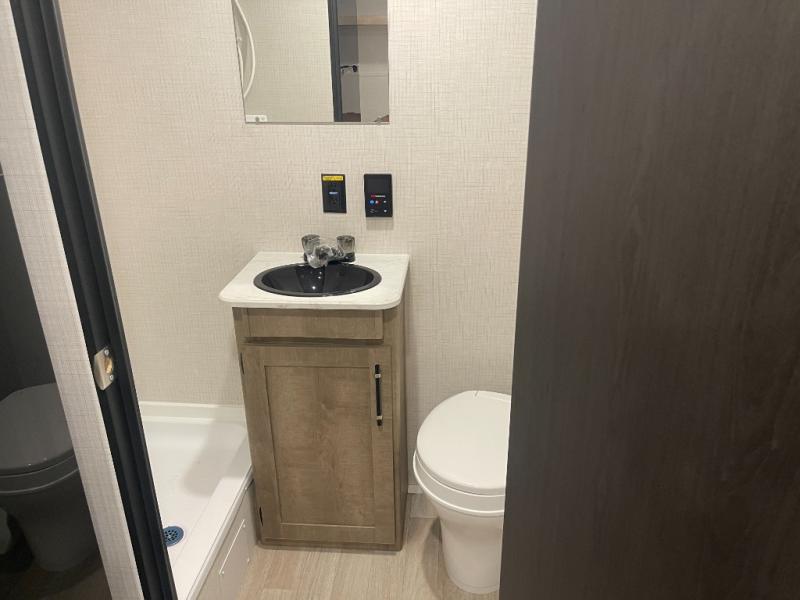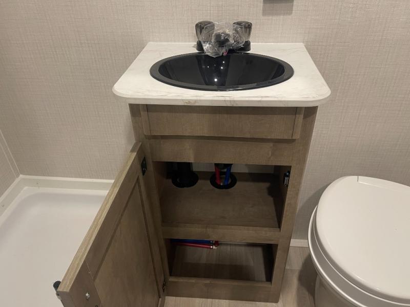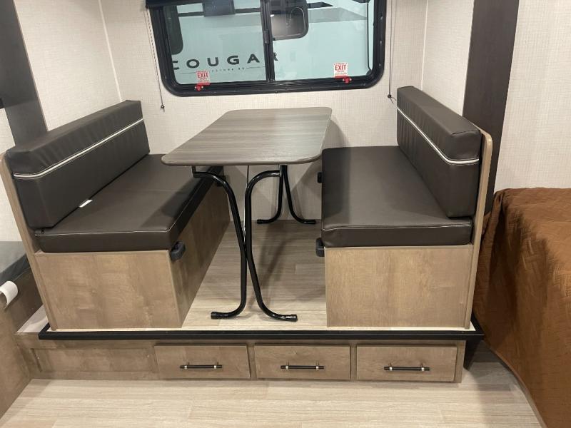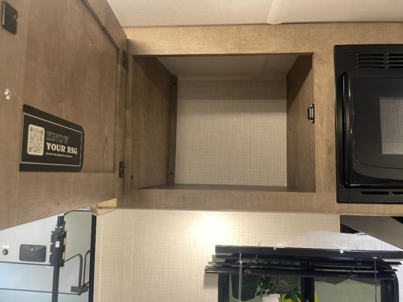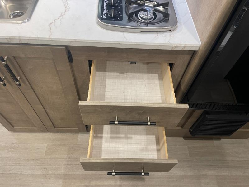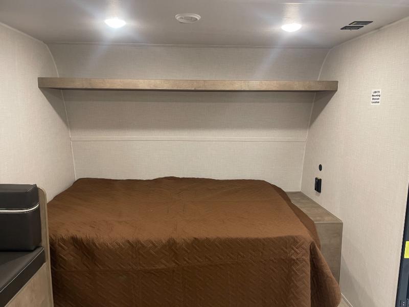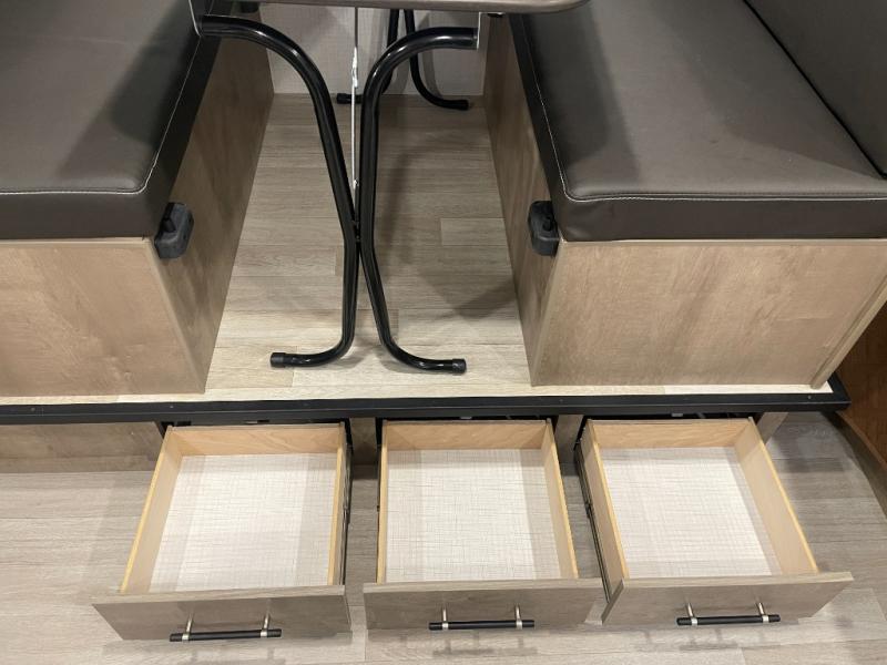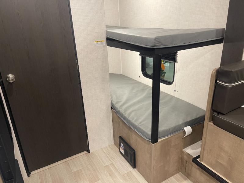 When you say "camping" your kids will immediately think about sleeping on the bunk beds and playing outdoors! There is something about planning the trip that gets everyone excited, and once at your campsite, the excitement grows. You will have your own bed up front as well as a closet and nightstand for your things. The booth dinette doubles as sleeping space and includes drawers for storage, plus the slide provides more floor space. The cook can make warm meals in the galley kitchen, and the full bathroom will keep everyone refreshed and ready for the next day.