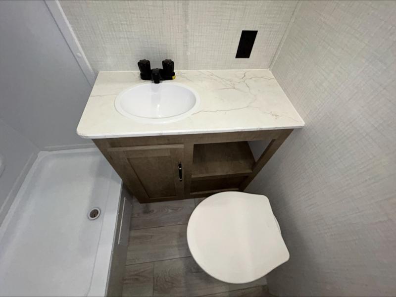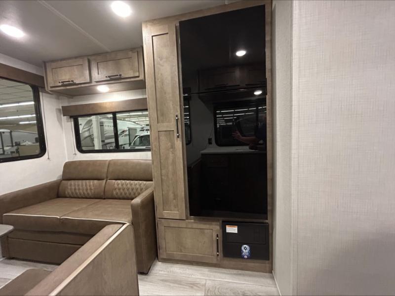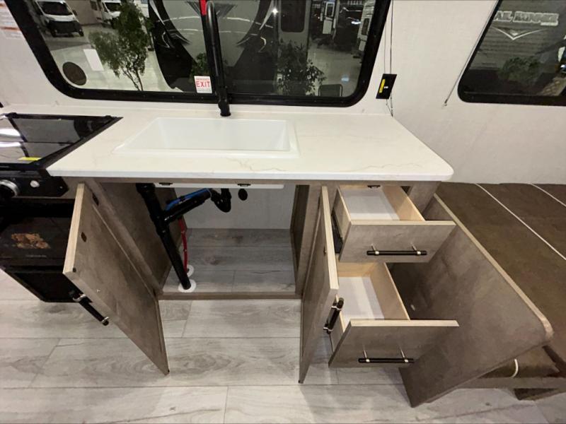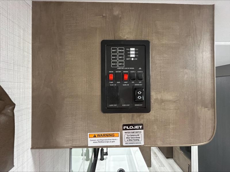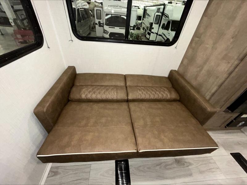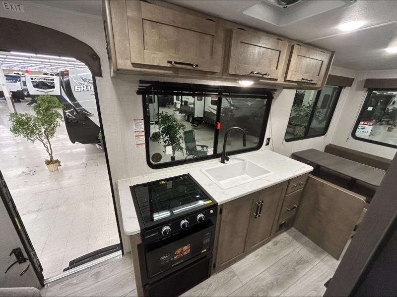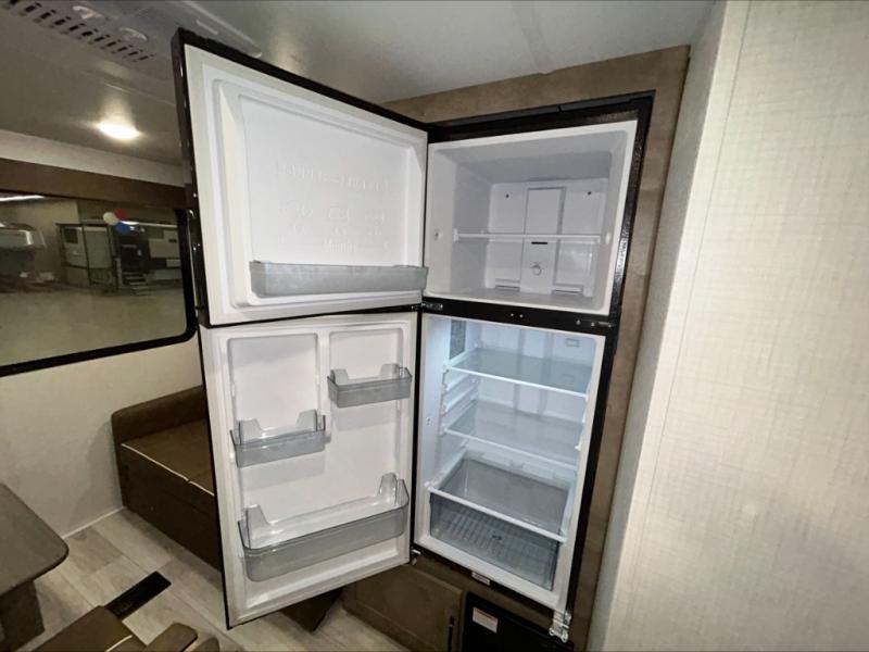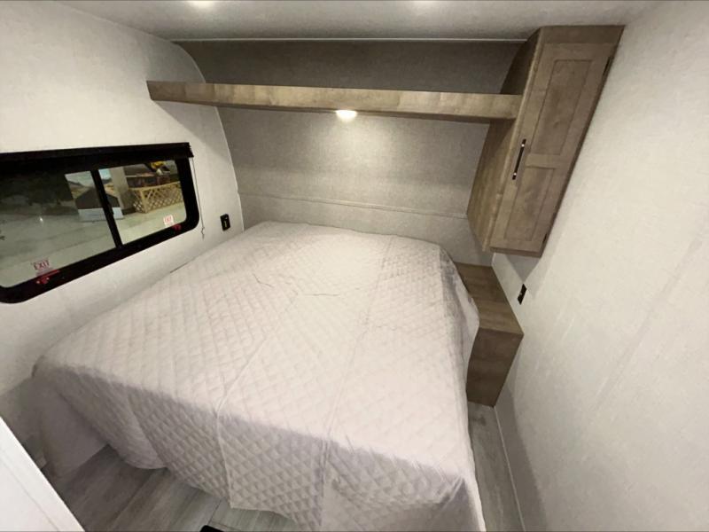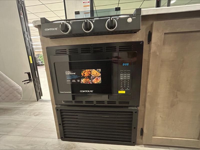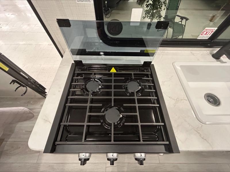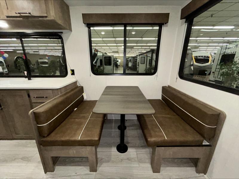 This trailer is perfect for your crew of four to six. There is a queen bed in the front bedroom, along with dual closets and nightstands to keep your things tidy. You can dine each day on the booth dinette, relax on the sofa, and house additional guests here at night. The kitchen includes everything you need to prepare meals each day, including a gas range, microwave, and a 10 cu. ft. 12V refrigerator for cold items. And the full bath on board lets you stay clean throughout each camping trip!