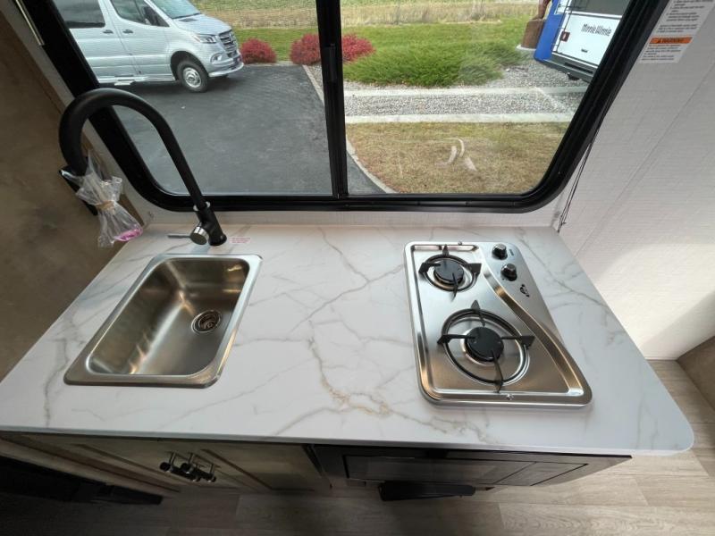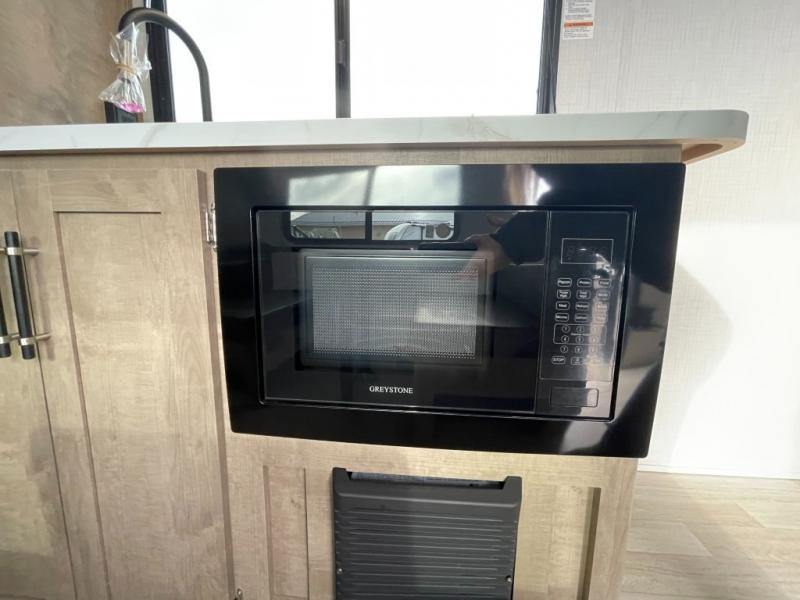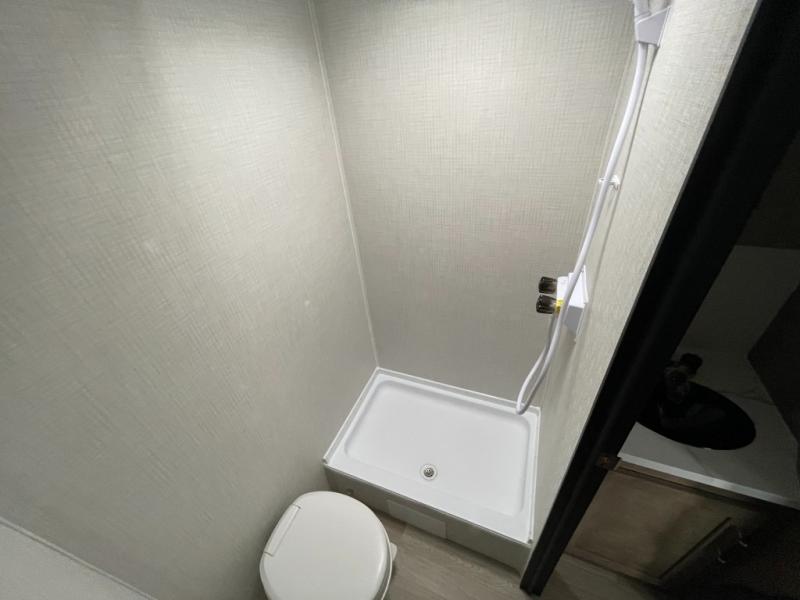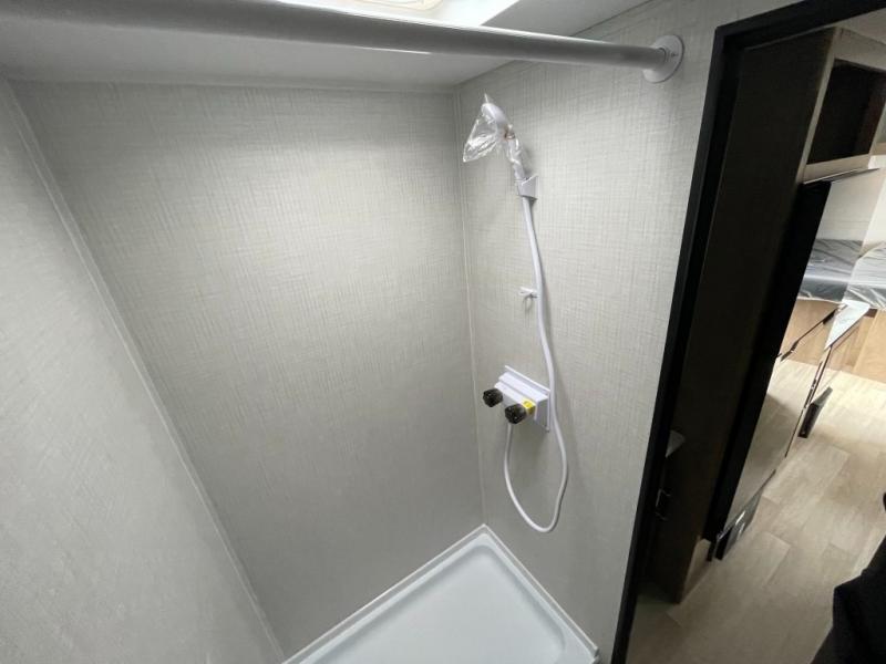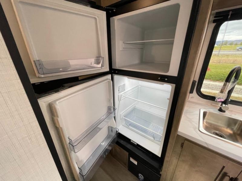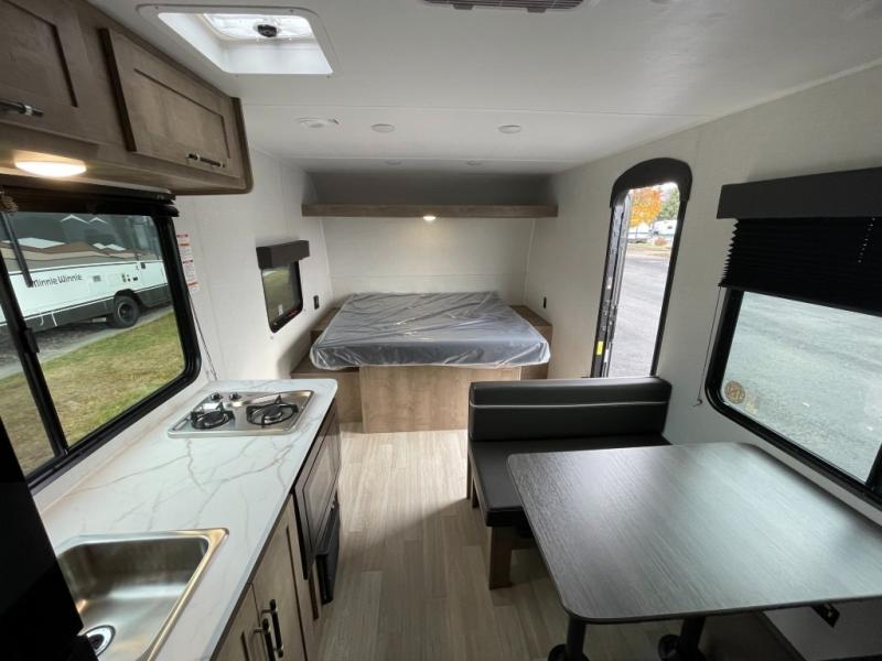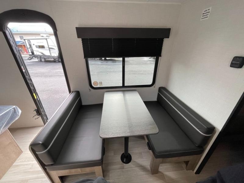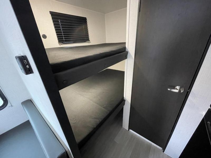 If you're looking for a travel trailer that can sleep seven to eight, this is the one! The bunk beds in the back are sure to make the little ones happy, and you can claim the front 60" x 74" queen bed all to yourselves. A private bath with a shower and toilet will let you clean up daily, and the full kitchen lets you make meals for your crew. You'll find a two-burner cooktop here, along with a sink and refrigerator. The booth dinette provides a place to dine together or play games in the evening, and an additional guest or two little ones can sleep here at night!
