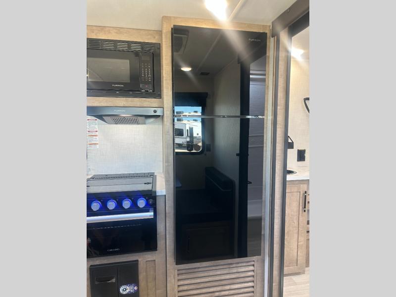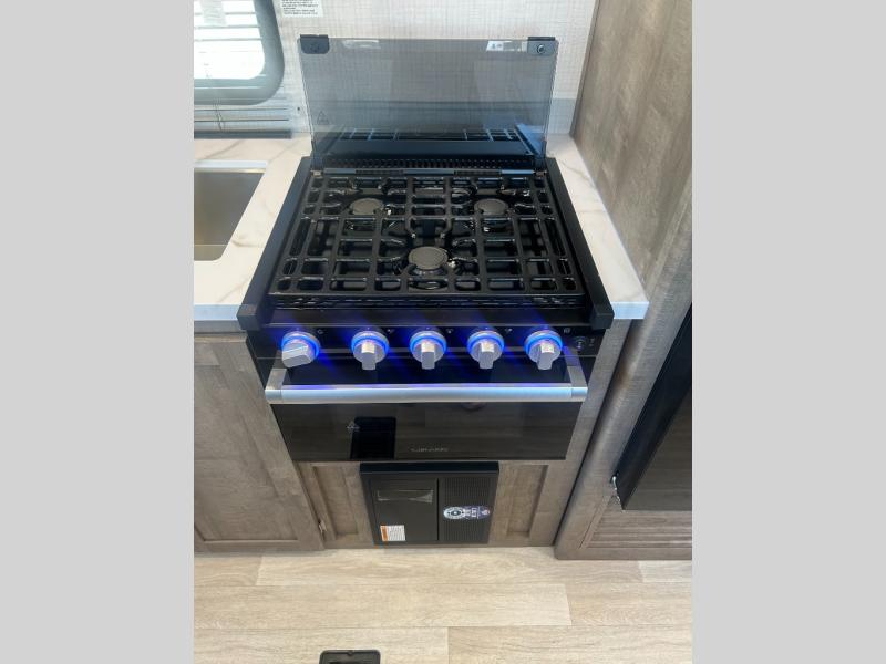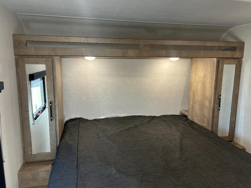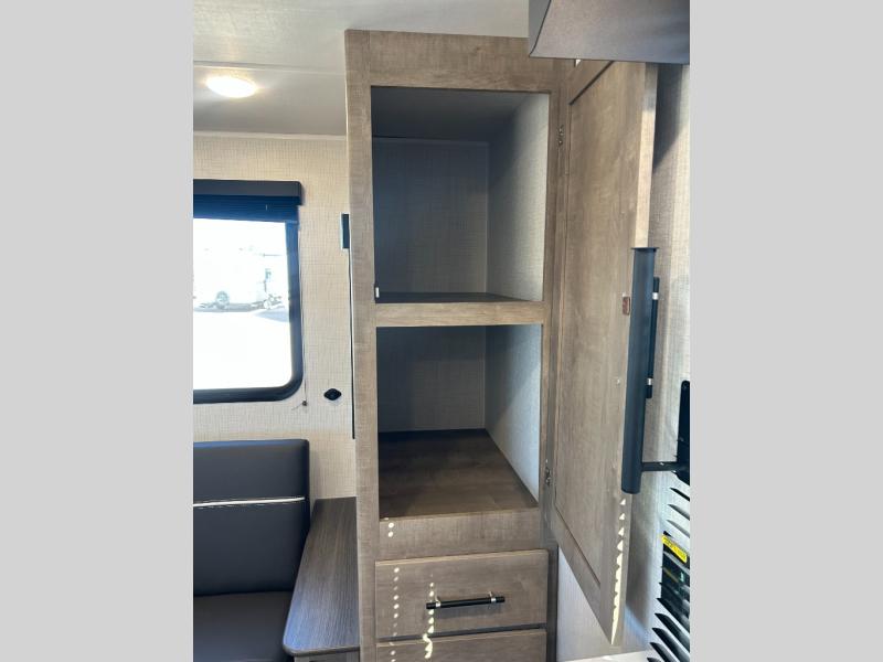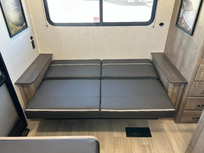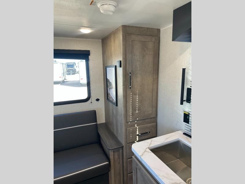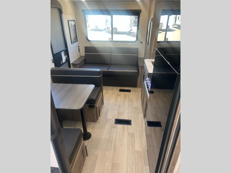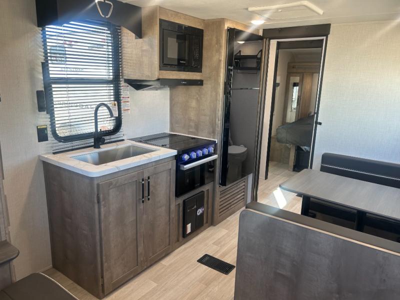 Comfort comes easy in this dual entry travel trailer! You can enter in through the front master bedroom with an Olympic RV queen bed or the rear living area with a sofa. There are also two end tables on either side of the sofa plus a spacious pantry for snacks and dry goods. A three-burner cooktop and air fryer microwave will let you make meals each day, and a booth dinette provides a place to dine together. And don't overlook the walk-through bath that is easily accessible from the bedroom or kitchen!