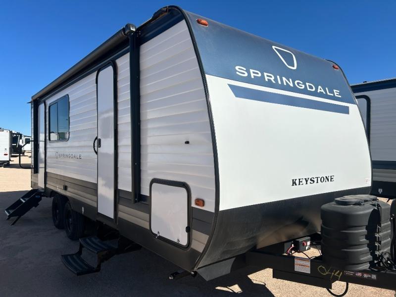 The Springdale Classic travel trailers by Keystone will provide you and your family many great outdoor experiences and it will also be kind to your pocketbook. Each one is constructed with a walkable roof, Solid Step entry steps and tinted safety glass windows. There are also heavy-duty stabilizer jacks, along with an outside shower, a power awning with LED lights, and Furrion backup camera prep. Inside, you'll find blackout night shades, pressed membrane premium countertops, a stainless-steel sink, and LED lighting to keep your space well lit.