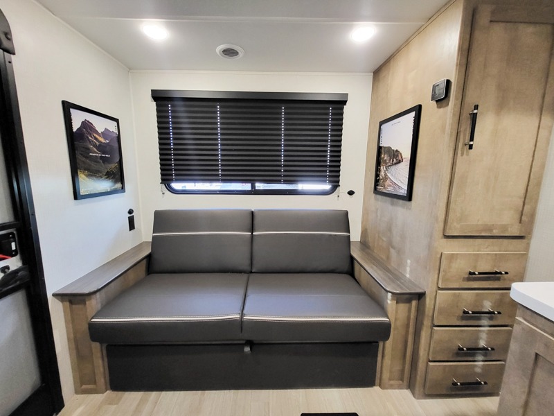 Comfort comes easy in this dual entry travel trailer! You can enter in through the front master bedroom with an Olympic RV queen bed or the rear living area with a sofa. There are also two end tables on either side of the sofa plus a spacious pantry for snacks and dry goods. A three-burner cooktop and air fryer microwave will let you make meals each day, and a booth dinette provides a place to dine together. And don't overlook the walk-through bath that is easily accessible from the bedroom or kitchen!