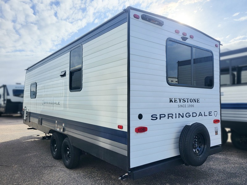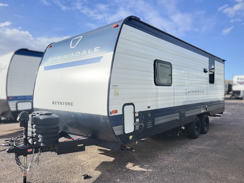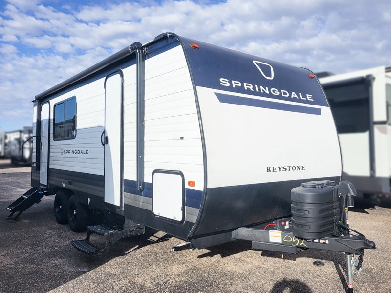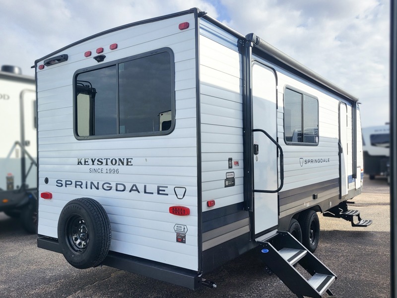 The Springdale travel trailers by Keystone will provide you and your family many great outdoor experiences and at-home comforts. Each one is constructed with a AlphaPly TPO roof membrane, Solid Step entry steps and XL tinted safety glass windows. There are also heavy-duty stabilizer jacks, along with an outside shower, a power awning with LED lights, and each model is SolarFlex ready if you choose to add solar power. Inside, you'll find blackout night shades, pressed membrane premium countertops, a stainless-steel sink, and LED lighting to keep your space well lit.