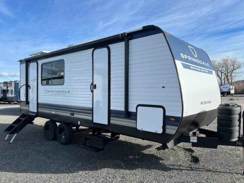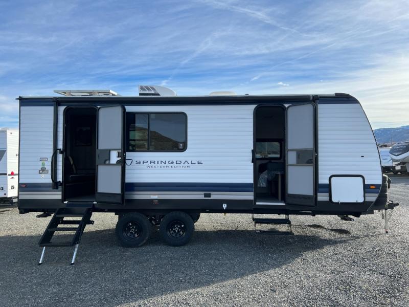 The private bedroom provides a restful retreat with a cozy sleeping space and generous closet room, and the bathroom is practical and convenient for life on the go. Outside, enjoy the convenience of a sturdy awning for shade and outdoor living, plus plenty of exterior storage for all your gear. Whether you’re heading out for a weekend getaway or planning an extended journey, the Springdale 2100RL combines comfort, style, and functionality in a package that feels like home wherever you roam.