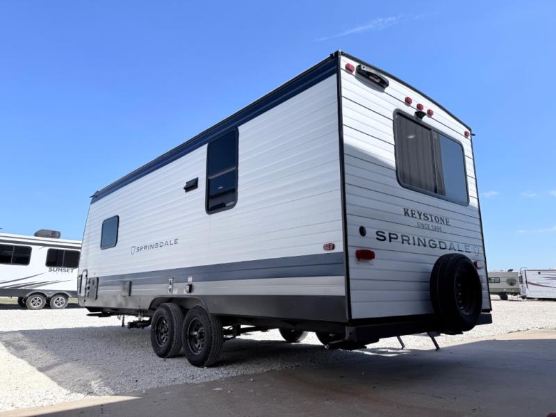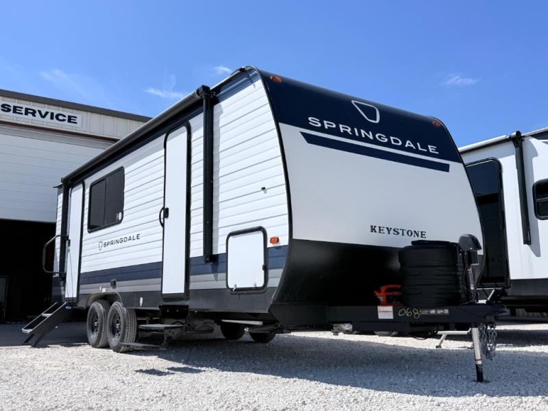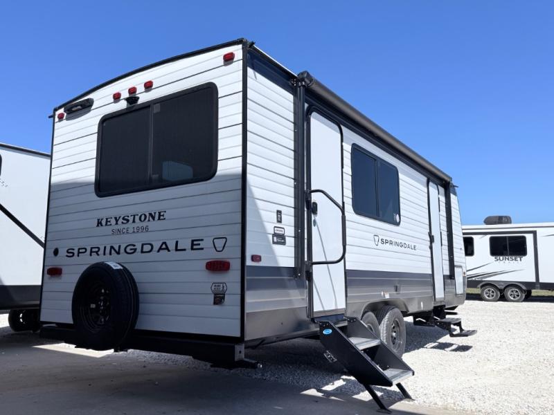 The Springdale travel trailers by Keystone will provide you and your family many great outdoor experiences and at-home comforts. Each one is constructed with a AlphaPly TPO roof membrane, Solid Step entry steps and XL tinted safety glass windows. There are also heavy-duty stabilizer jacks, along with an outside shower, a power awning with LED lights, and each model is SolarFlex ready if you choose to add solar power. Inside, you'll find blackout night shades, pressed membrane premium countertops, a stainless-steel sink, and LED lighting to keep your space well lit.