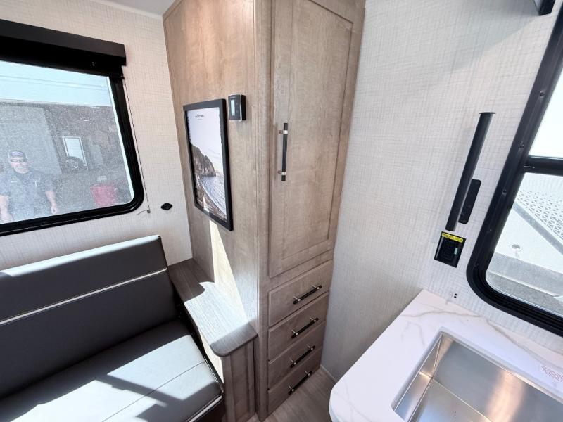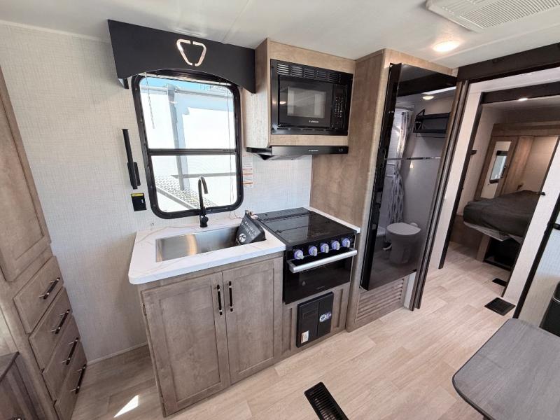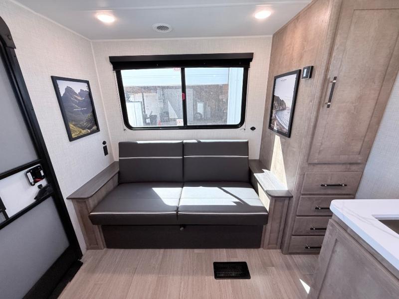 Comfort comes easy in this dual entry travel trailer! You can enter in through the front master bedroom with an Olympic RV queen bed or the rear living area with a sofa. There are also two end tables on either side of the sofa plus a spacious pantry for snacks and dry goods. A three-burner cooktop and air fryer microwave will let you make meals each day, and a booth dinette provides a place to dine together. And don't overlook the walk-through bath that is easily accessible from the bedroom or kitchen!