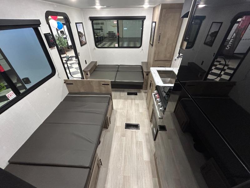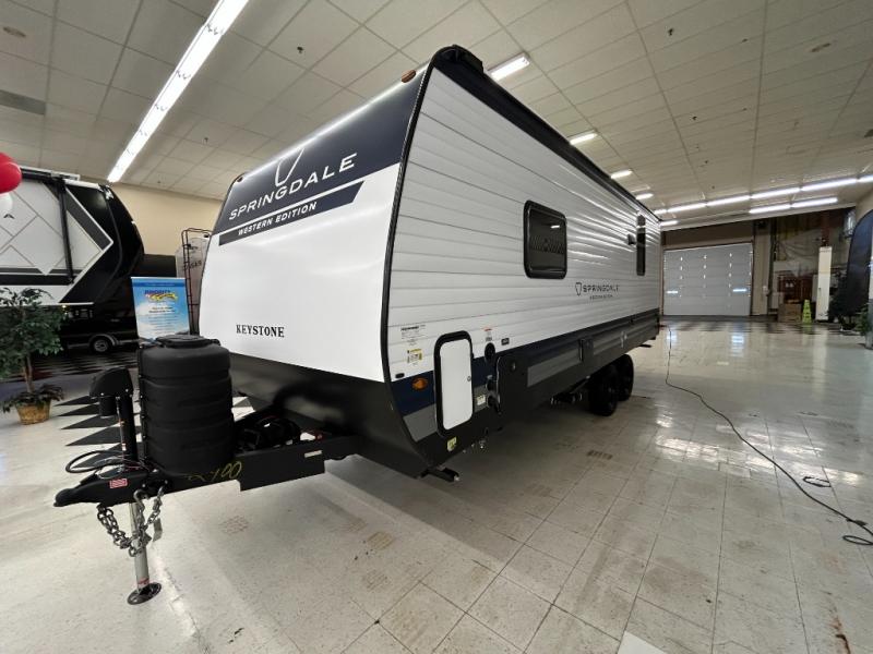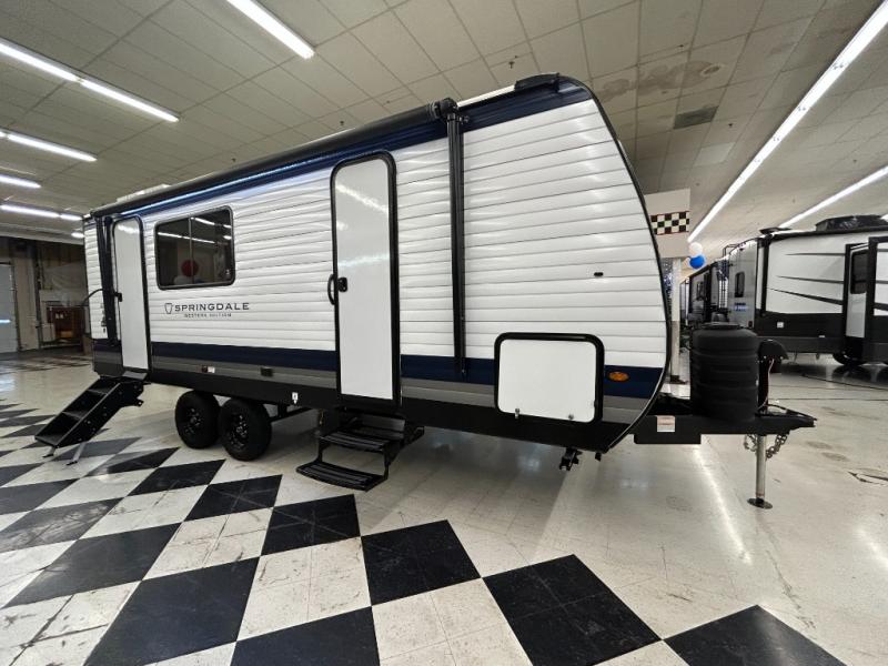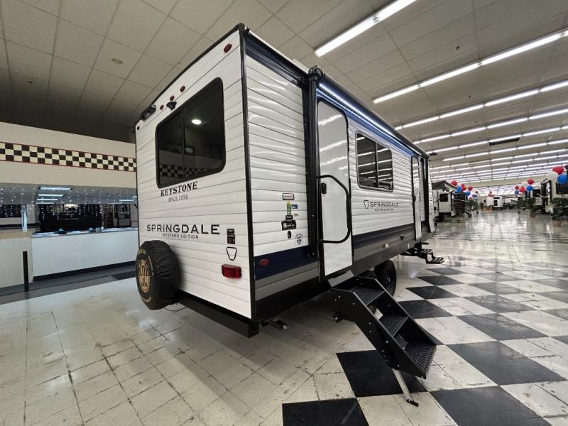 The Springdale travel trailers by Keystone will provide you and your family many great outdoor experiences and at-home comforts. Each one is constructed with a AlphaPly TPO roof membrane, Solid Step entry steps and XL tinted safety glass windows. There are also heavy-duty stabilizer jacks, along with an outside shower, a power awning with LED lights, and each model is SolarFlex ready if you choose to add solar power. Inside, you'll find blackout night shades, pressed membrane premium countertops, a stainless-steel sink, and LED lighting to keep your space well lit.