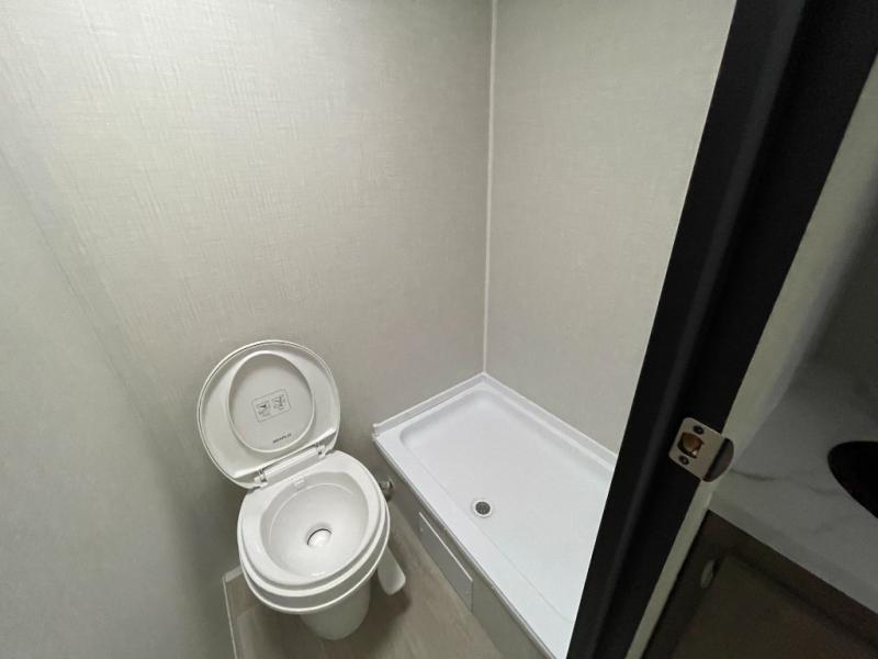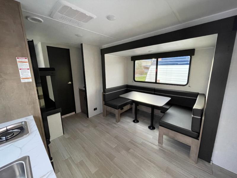 You'll love the amount of interior space in this travel trailer thanks to the U-shaped dinette slide! You can play games here, dine, and even let extra guests sleep over who haven't claimed the bunk beds. The front bedroom includes a queen bed with an overhead shelf where you can sleep soundly and store your books. After you've made dinner on the two-burner cooktop, you can take your plate outdoors to dine under the 16' power awning. There is also an exterior pass-thru storage where you can keep hiking gear, fishing poles and more!