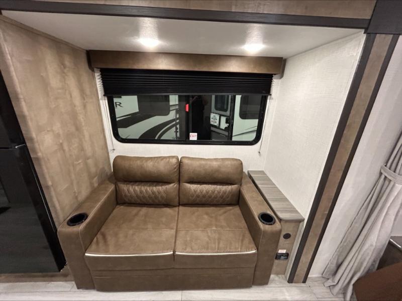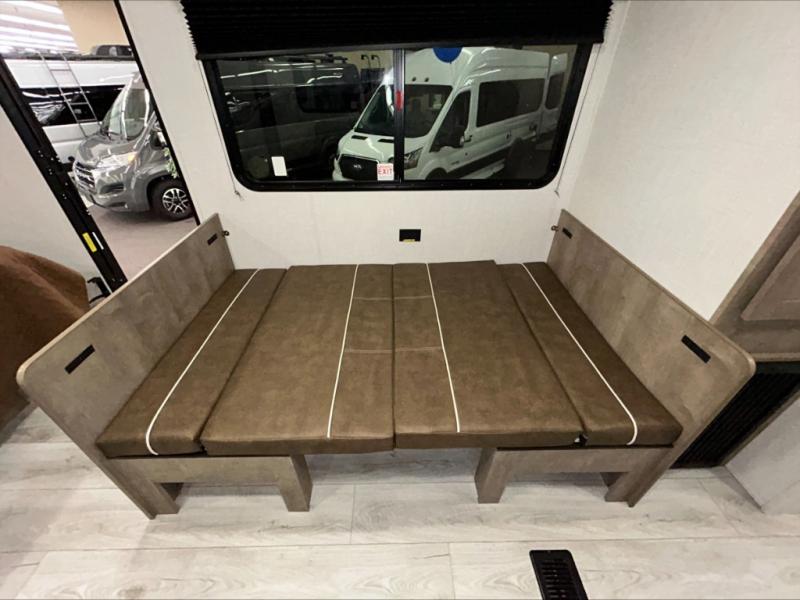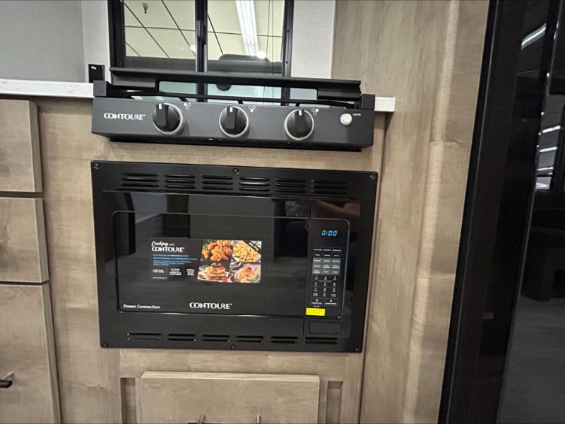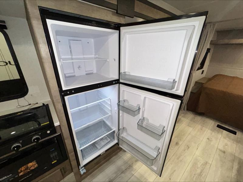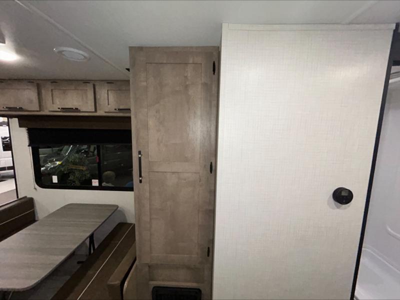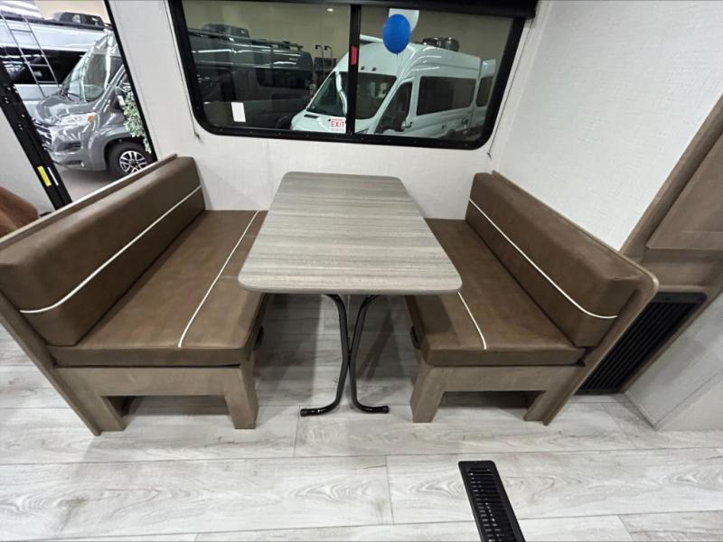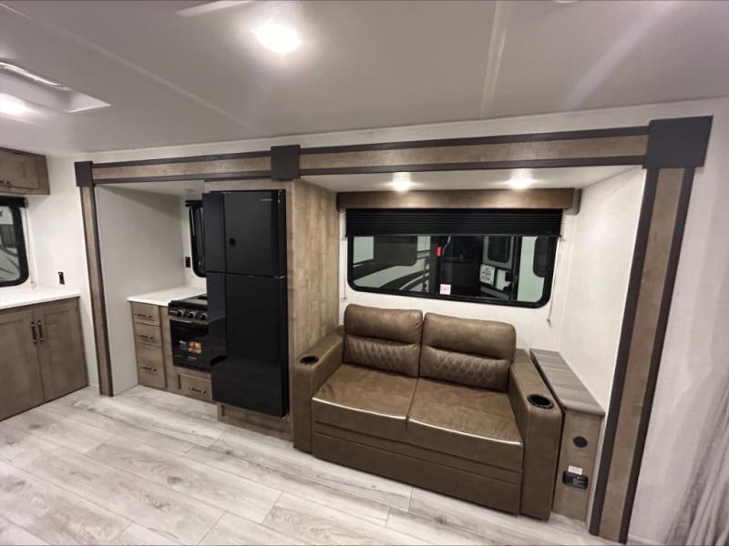You'll love the added space in this travel trailer thanks to the large slide out. Here, you'll find the sofa with an end table, plus the 12V refrigerator and three burner gas range. There is kitchen counter space in the rear corner, and you'll find the full bath in the other rear corner for easy use. The front queen bed includes a privacy curtain for when you have guests staying over on the sofa and booth dinette, plus there are dual bedside closets and nightstands for your things!