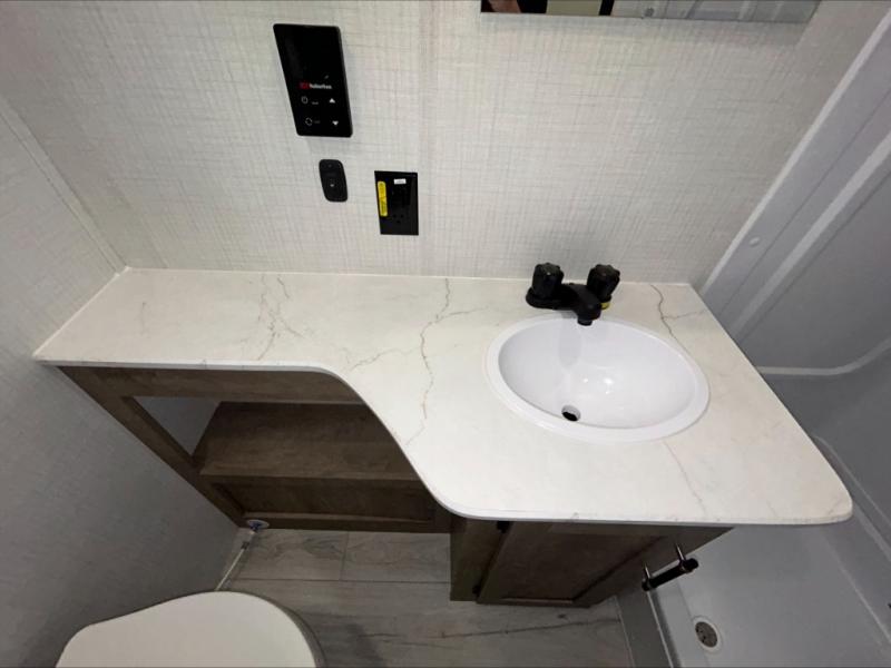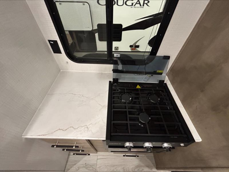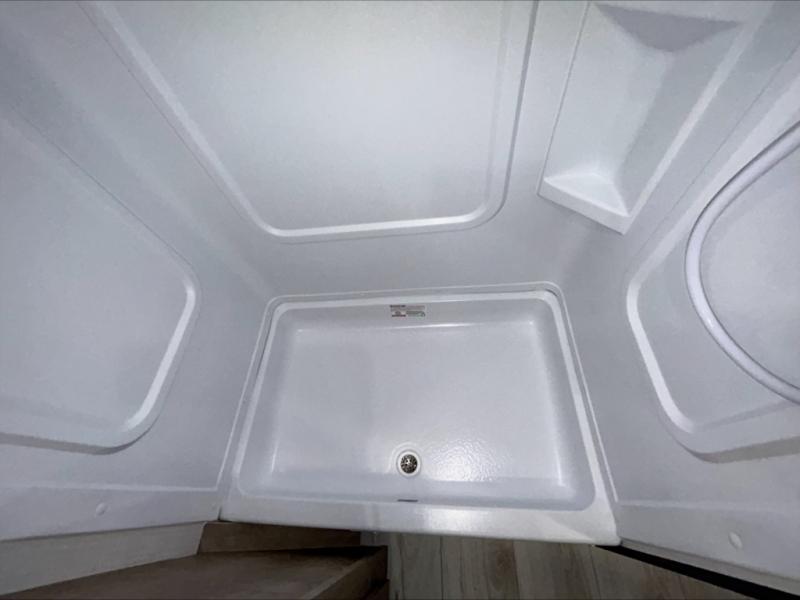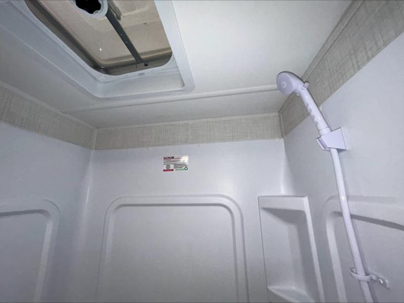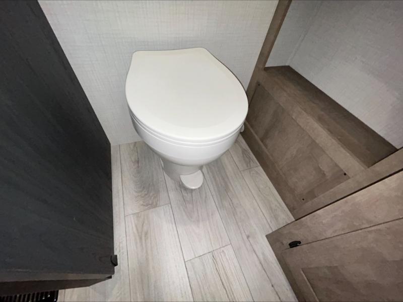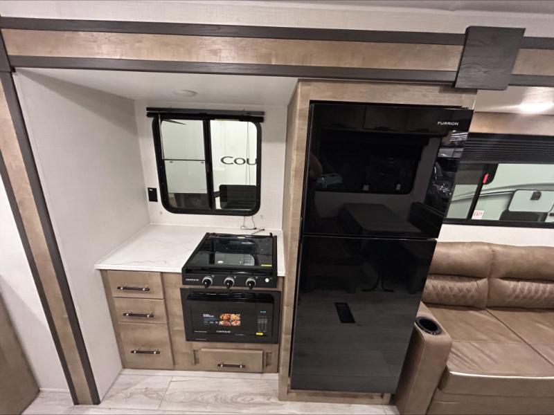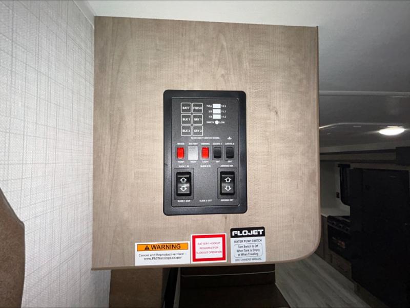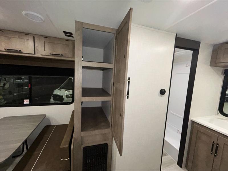 You'll love the added space in this travel trailer thanks to the large slide out. Here, you'll find the sofa with an end table, plus the 12V refrigerator and three burner gas range. There is kitchen counter space in the rear corner, and you'll find the full bath in the other rear corner for easy use. The front queen bed includes a privacy curtain for when you have guests staying over on the sofa and booth dinette, plus there are dual bedside closets and nightstands for your things!