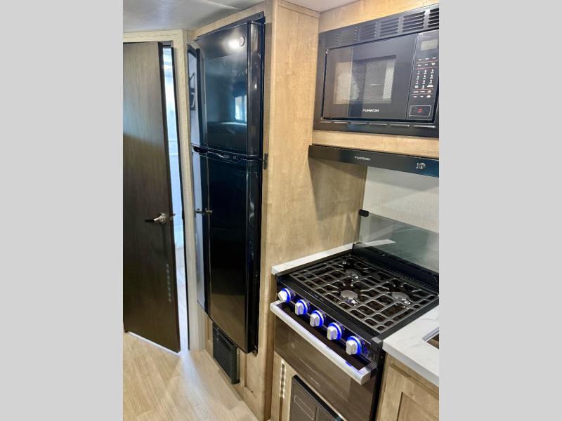This cute Springdale Mini bunk model will easily sleep seven with the double-size bunks, booth dinette, and queen Murphy bed which features a fold-down sofa at the end. During the daytime, you can have the seating you need and want, and at night the sofa folds to become part of the front bed. The rear corner bath is convenient and features a tub, toilet, and sink. The kitchen is fully equipped to allow you to cook as you travel, and you can enjoy meals while under the 15' power awning.