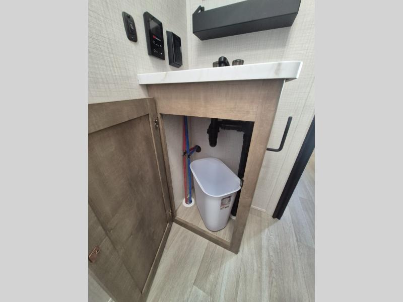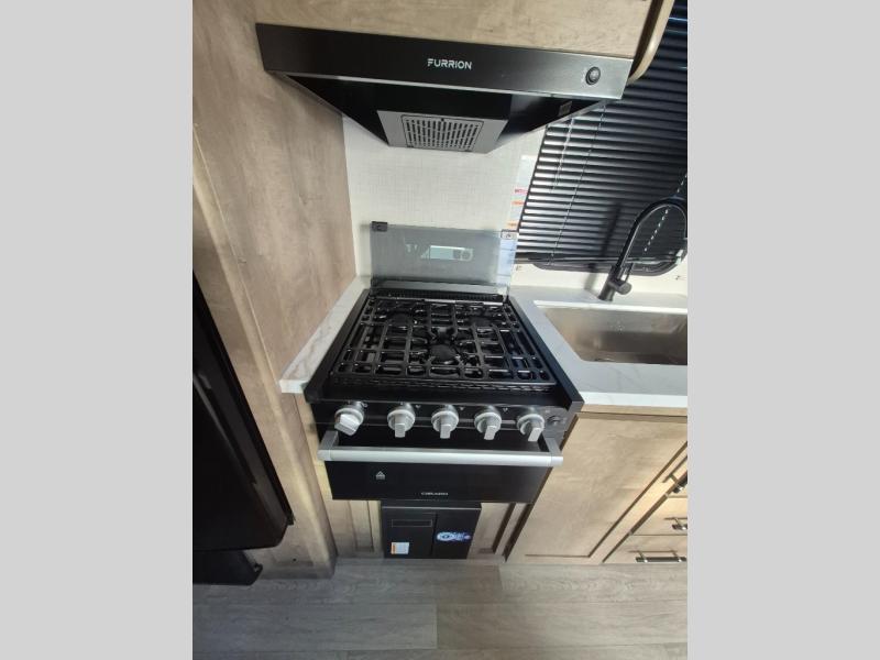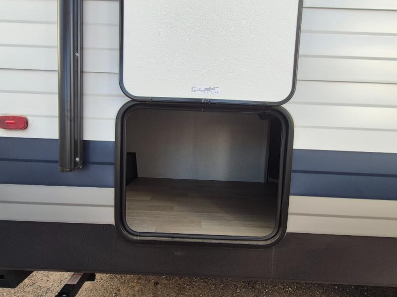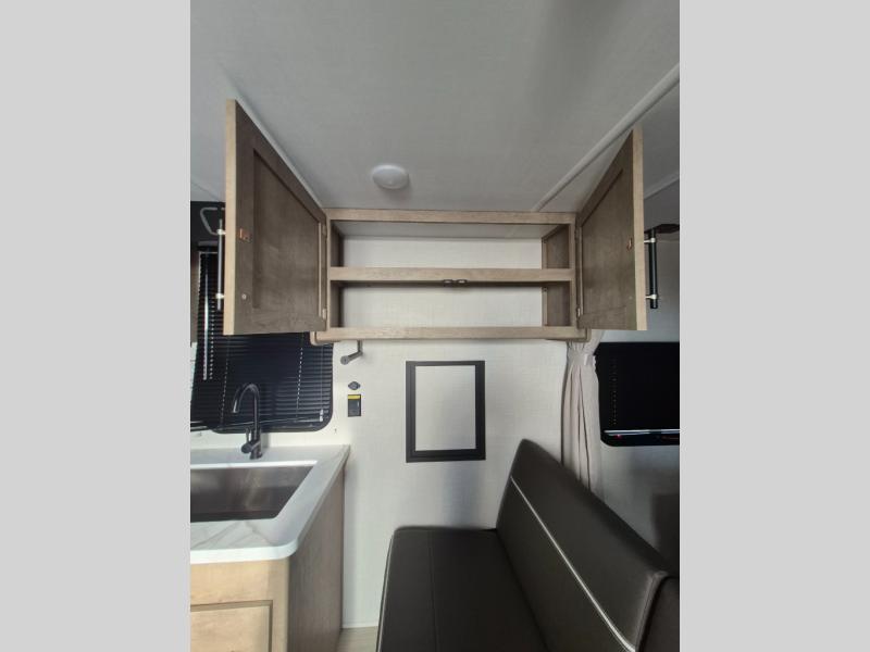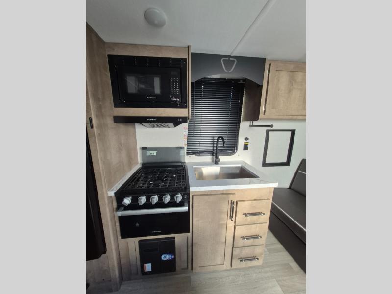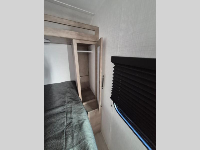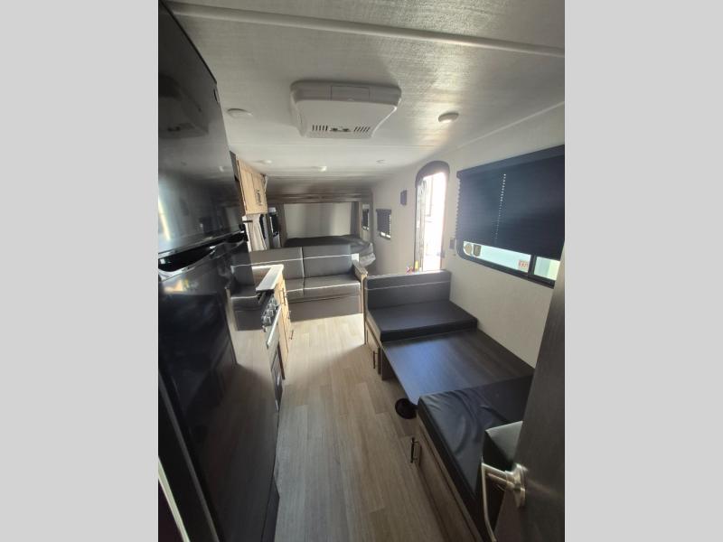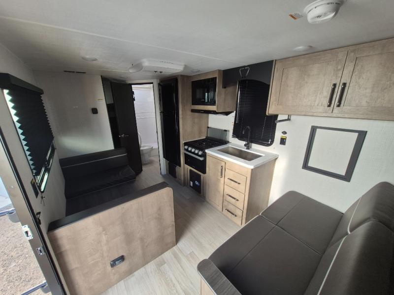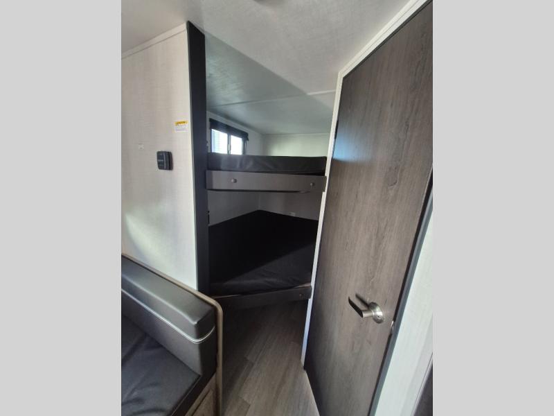 Plan fun trips at the campground in this travel trailer with double-size bunks for your guests or little ones, plus a front bedroom with a walk-around Olympic RV queen bed! The dual bedside wardrobes and overhead shelf will keep your personal belongings organized, and the exterior pass-through will be perfect for fishing poles and camp gear. A full kitchen includes a three-burner cooktop and an air fryer microwave to cook your best meals, and a booth dinette provides a place to dine at. There is also a sofa with an end table where you can enjoy your morning coffee at.