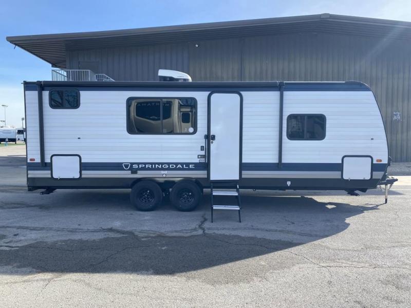 The Springdale travel trailers by Keystone will provide you and your family many great outdoor experiences and at-home comforts. Each one is constructed with a AlphaPly TPO roof membrane, Solid Step entry steps and XL tinted safety glass windows. There are also heavy-duty stabilizer jacks, along with an outside shower, a power awning with LED lights, and each model is SolarFlex ready if you choose to add solar power. Inside, you'll find blackout night shades, pressed membrane premium countertops, a stainless-steel sink, and LED lighting to keep your space well lit.