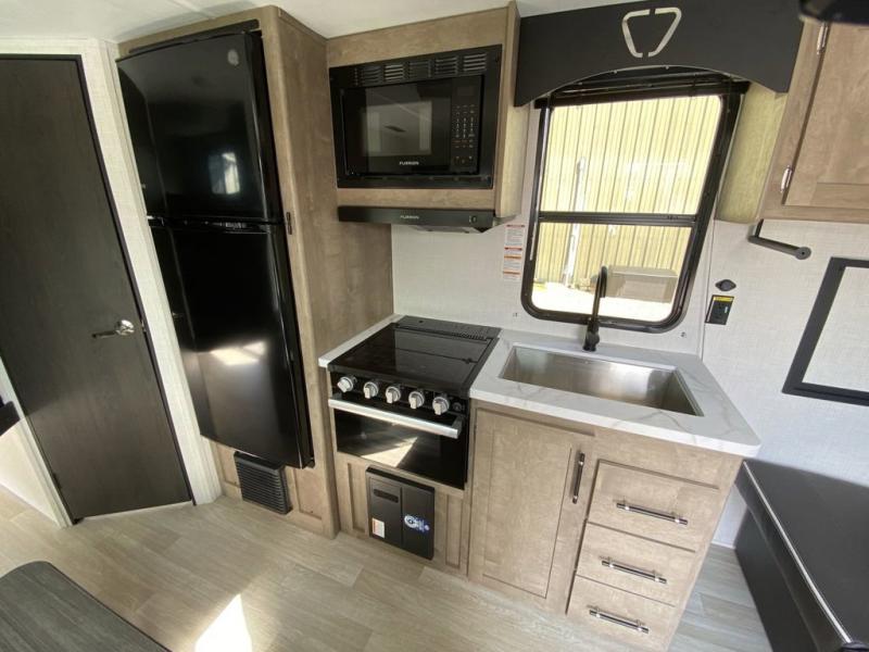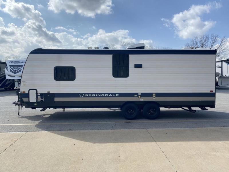 The Springdale travel trailers by Keystone will provide you and your family many great outdoor experiences and at-home comforts. Each one is constructed with a AlphaPly TPO roof membrane, Solid Step entry steps and XL tinted safety glass windows. There are also heavy-duty stabilizer jacks, along with an outside shower, a power awning with LED lights, and each model is SolarFlex ready if you choose to add solar power. Inside, you'll find blackout night shades, pressed membrane premium countertops, a stainless-steel sink, and LED lighting to keep your space well lit.