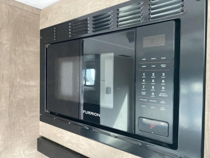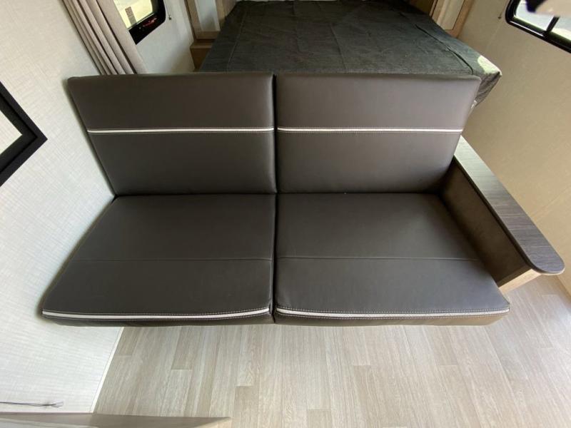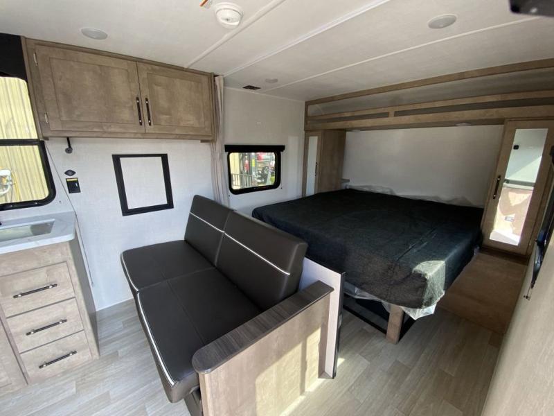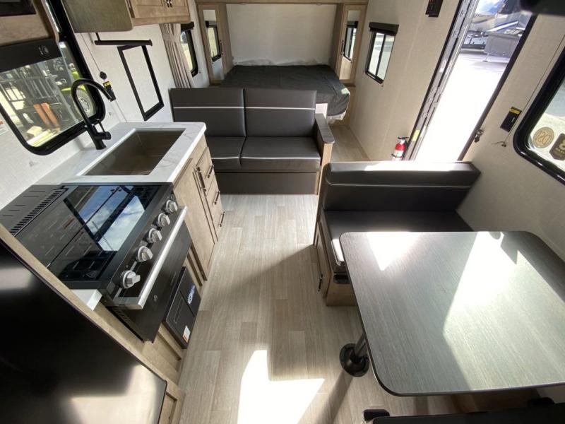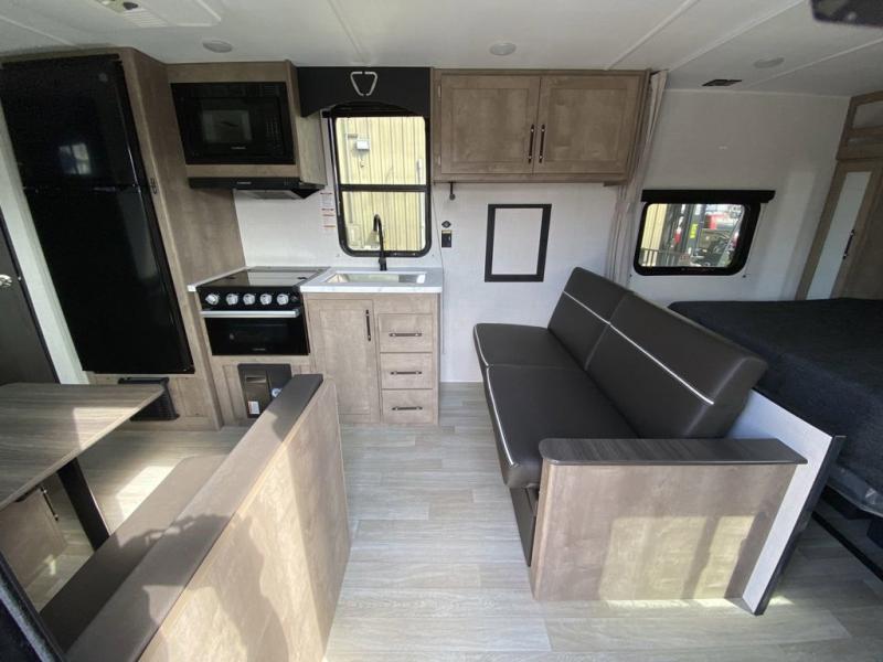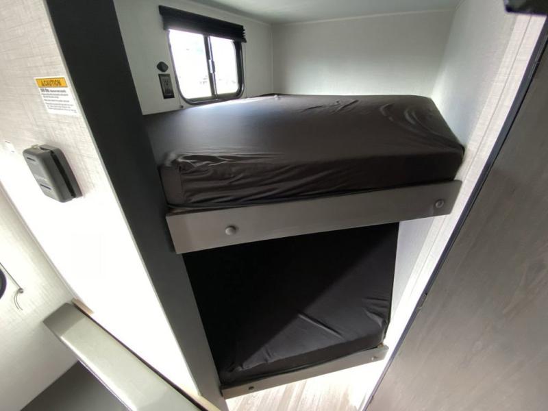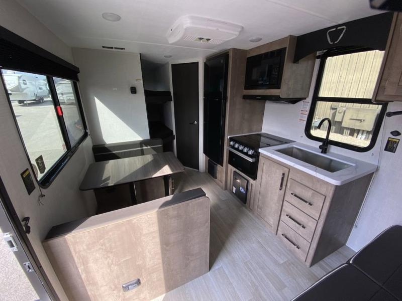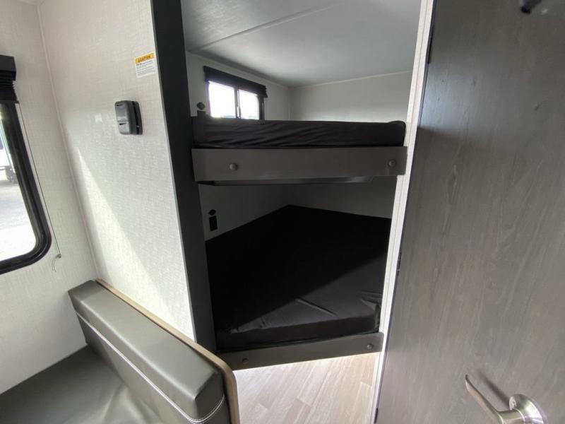 Plan fun trips at the campground in this travel trailer with double-size bunks for your guests or little ones, plus a front bedroom with a walk-around Olympic RV queen bed! The dual bedside wardrobes and overhead shelf will keep your personal belongings organized, and the exterior pass-through will be perfect for fishing poles and camp gear. A full kitchen includes a three-burner cooktop and an air fryer microwave to cook your best meals, and a booth dinette provides a place to dine at. There is also a sofa with an end table where you can enjoy your morning coffee at.