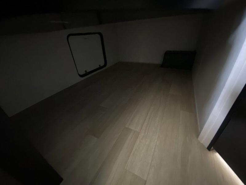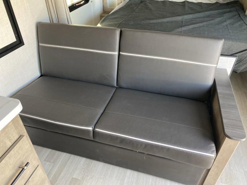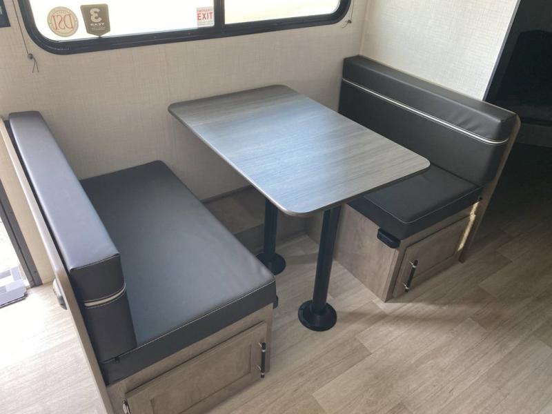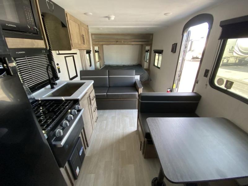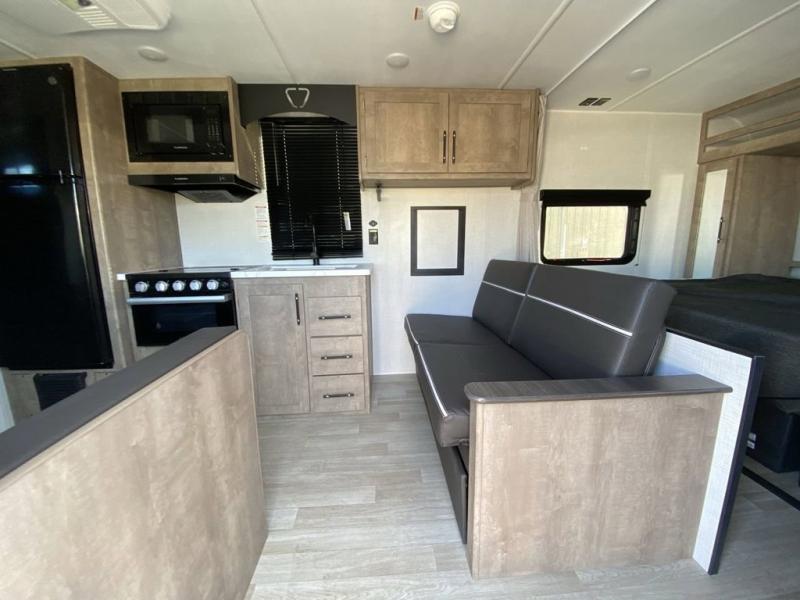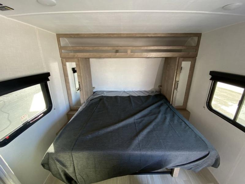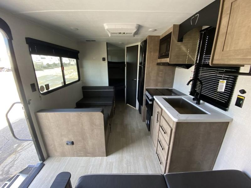 Plan fun trips at the campground in this travel trailer with double-size bunks for your guests or little ones, plus a front bedroom with a walk-around Olympic RV queen bed! The dual bedside wardrobes and overhead shelf will keep your personal belongings organized, and the exterior pass-through will be perfect for fishing poles and camp gear. A full kitchen includes a three-burner cooktop and an air fryer microwave to cook your best meals, and a booth dinette provides a place to dine at. There is also a sofa with an end table where you can enjoy your morning coffee at.