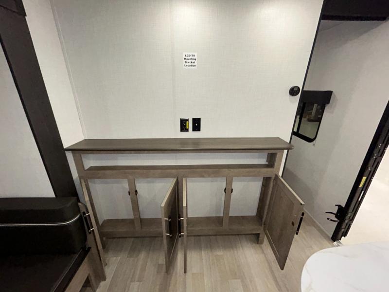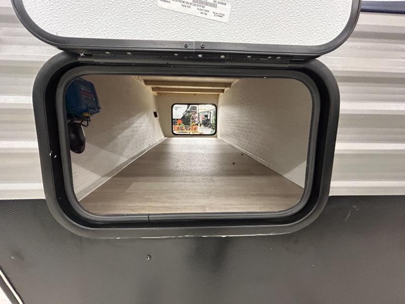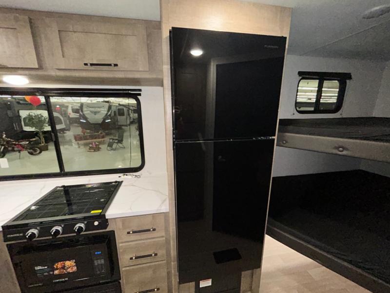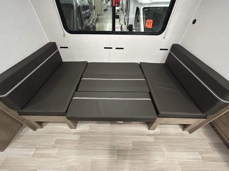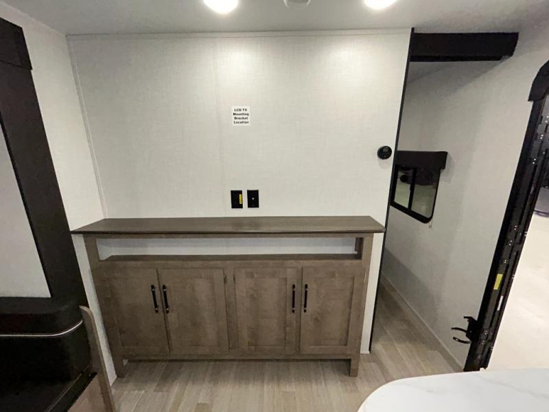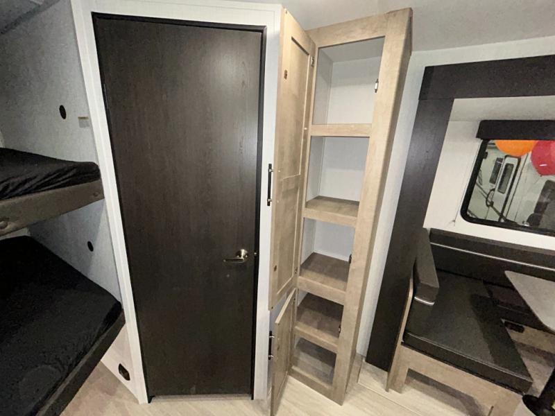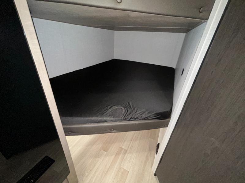 This bunkhouse travel trailer has room for your whole crowd! Enjoy the rear bunks or flip up the bottom one for more space. The front bedroom has a sliding door for privacy, plus dual closets and night stands. The kitchen features a three-burner range and 10 cu. ft. 12V refrigerator. Everyone will gather at the U-shape dinette. An entertainment center is standard and prepped for a TV. There is a front pass-through for housing all of your outdoor gear, as well as additional protection from the elements.