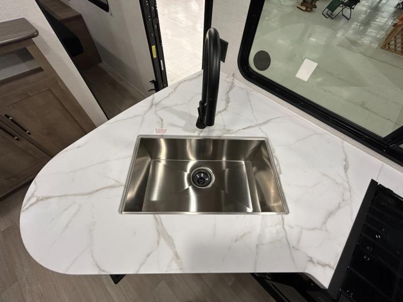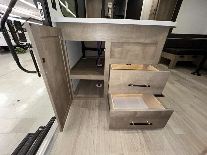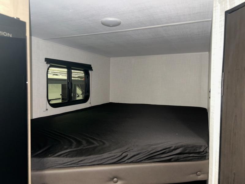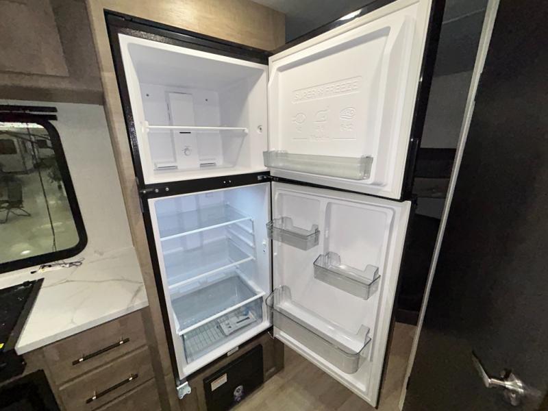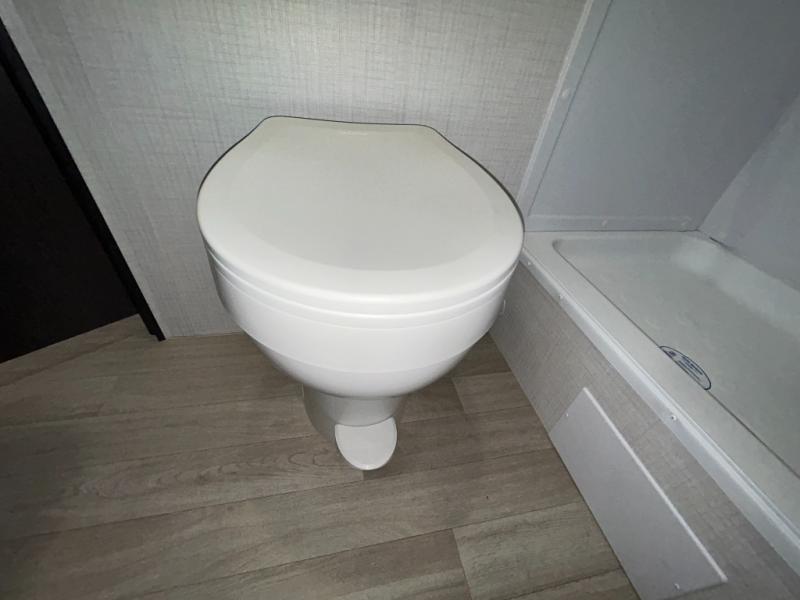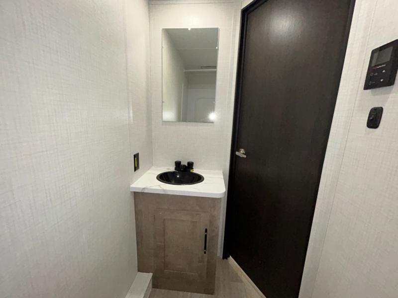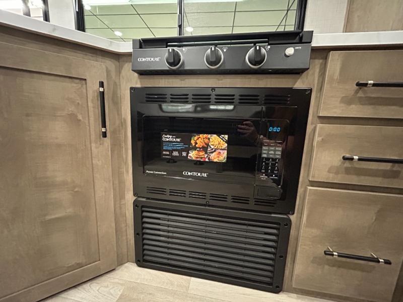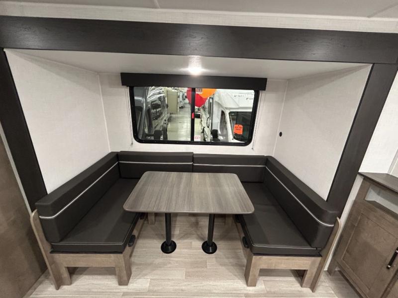 This bunkhouse travel trailer has room for your whole crowd! Enjoy the rear bunks or flip up the bottom one for more space. The front bedroom has a sliding door for privacy, plus dual closets and night stands. The kitchen features a three-burner range and 10 cu. ft. 12V refrigerator. Everyone will gather at the U-shape dinette. An entertainment center is standard and prepped for a TV. There is a front pass-through for housing all of your outdoor gear, as well as additional protection from the elements.