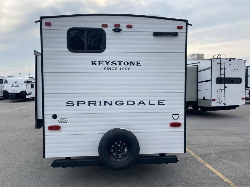 The Springdale Classic travel trailers by Keystone will provide you and your family many great outdoor experiences and it will also be kind to your pocketbook. Each one is constructed with an aluminum exterior, a walkable roof, and an I-beam frame with stamped steel cross-members and outriggers for added strength. There are also heavy duty stabilizer jacks and power tongue jacks outside, along with an XL entry assist handle for added convenience. Each travel trailer includes LED lighting, bedside outlets, and blackout night shades inside that will provide you with more privacy at night.