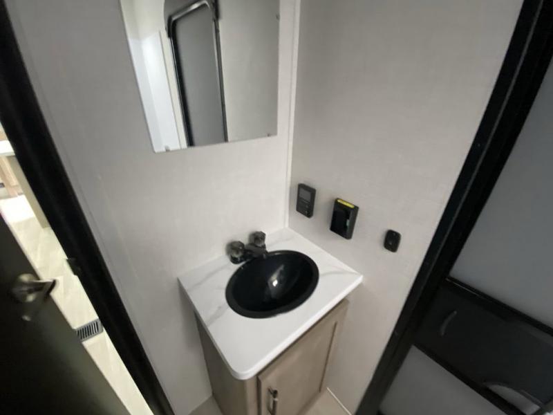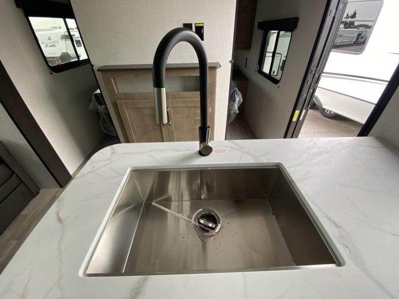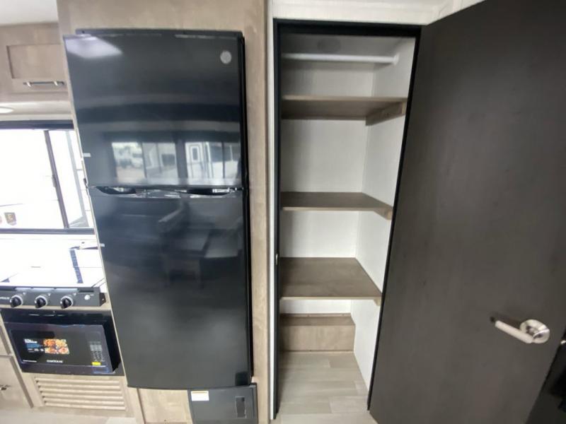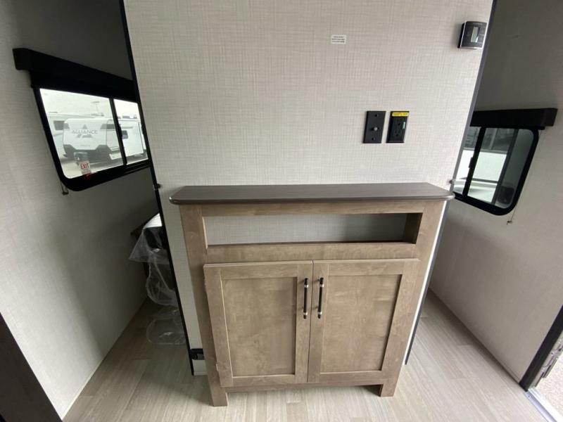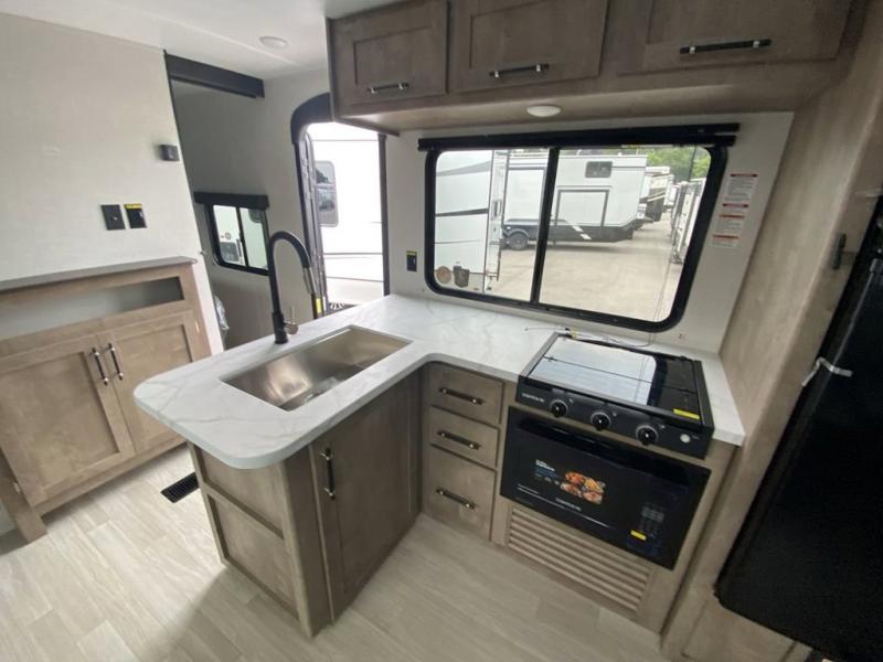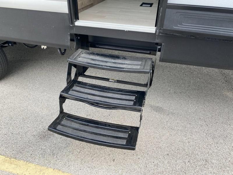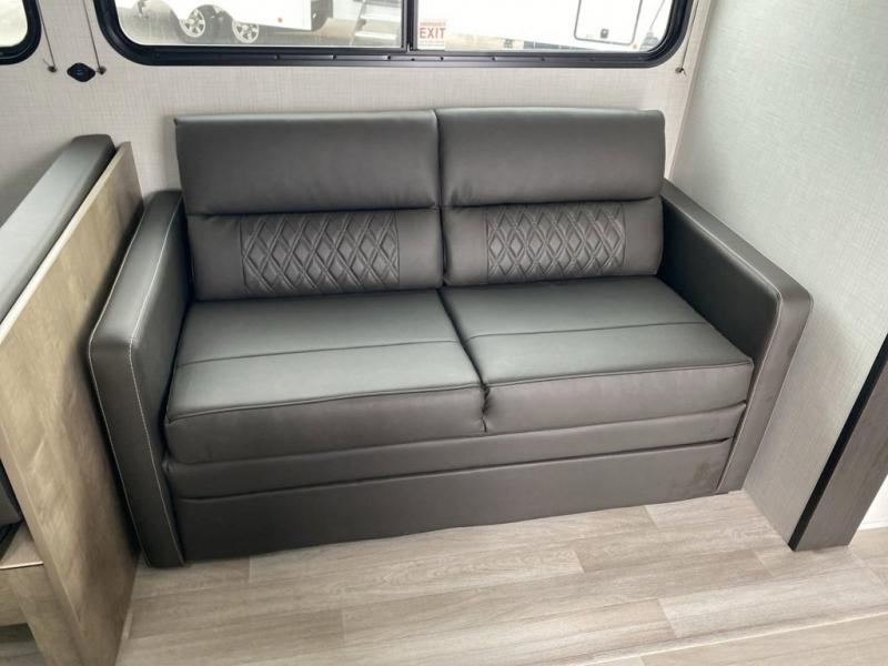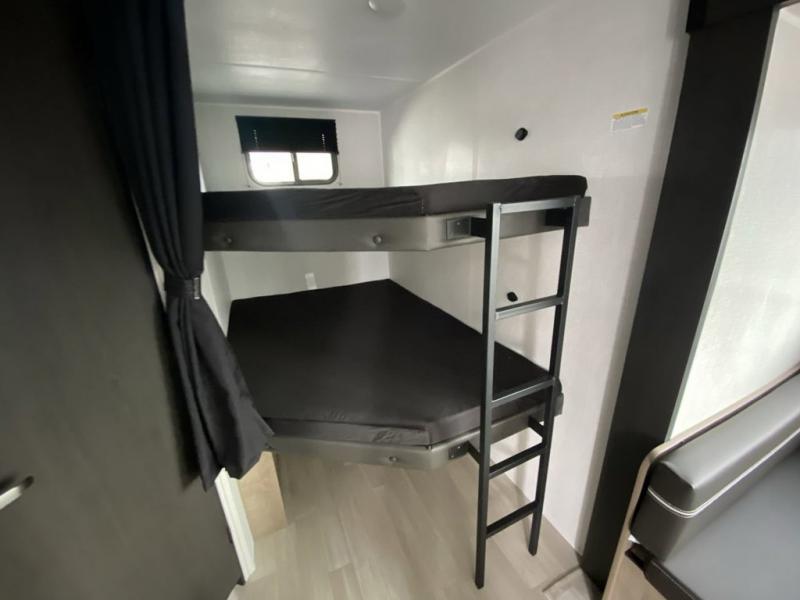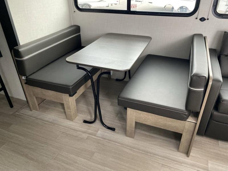You'll have additional space to stretch out in this travel trailer for eight to ten! Within the slide you'll find the booth dinette and sofa that will be perfect for meal times, relaxing, and sleeping more guests, and there is an entertainment with TV prep for movie nights. The little ones will love the double-size bunks, and the full bath is close by for easy nighttime use. You'll have the front private bedroom with a queen bed all to yourselves, plus there are dual closets and nightstands for your things. This model also includes an exterior pass-through storage outside and a 16' power awning for protection against the sun!