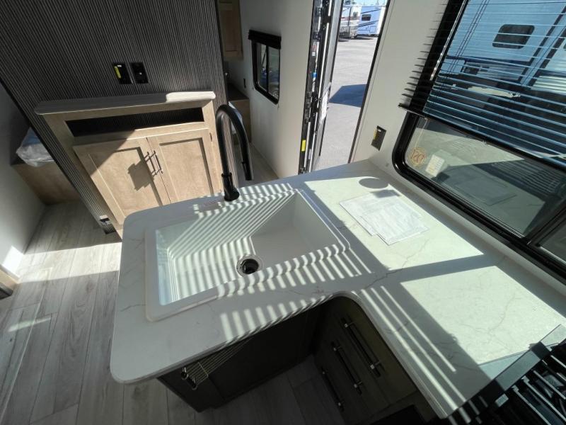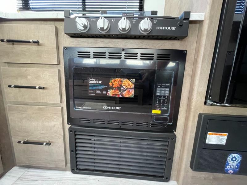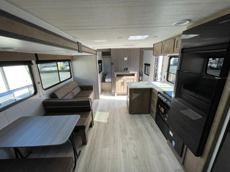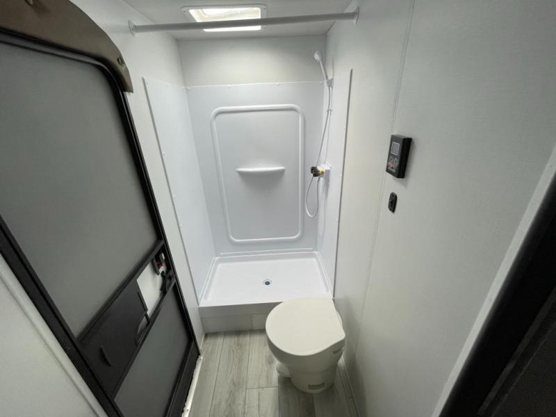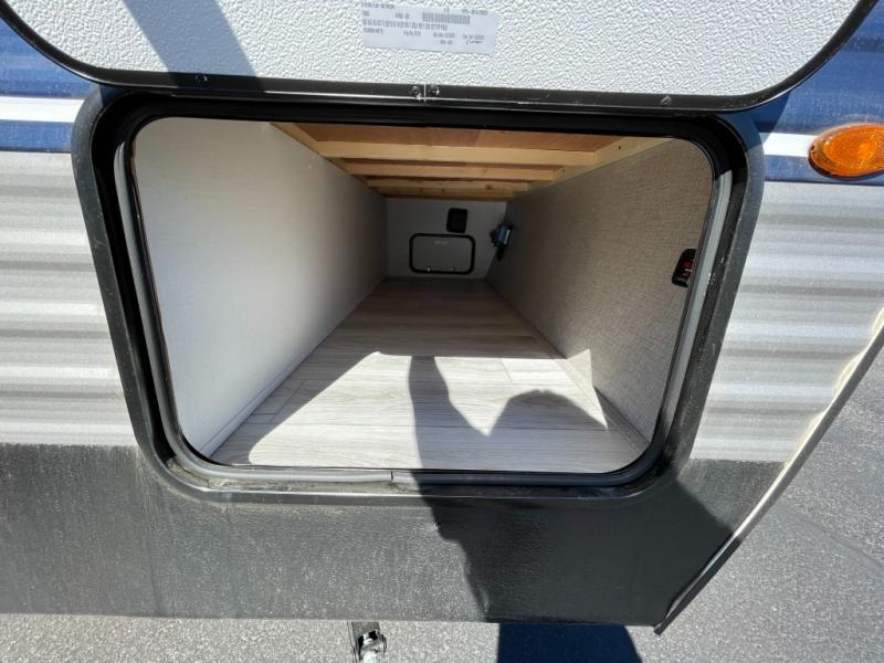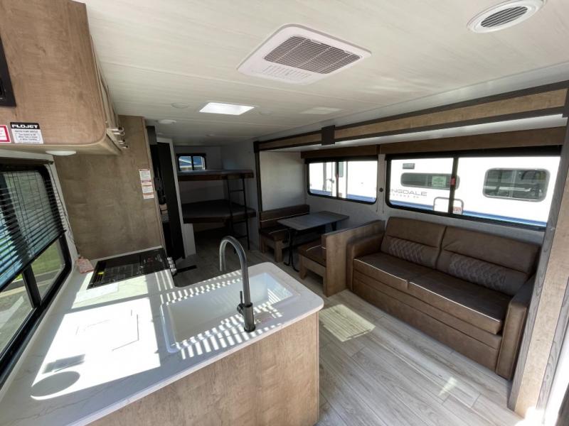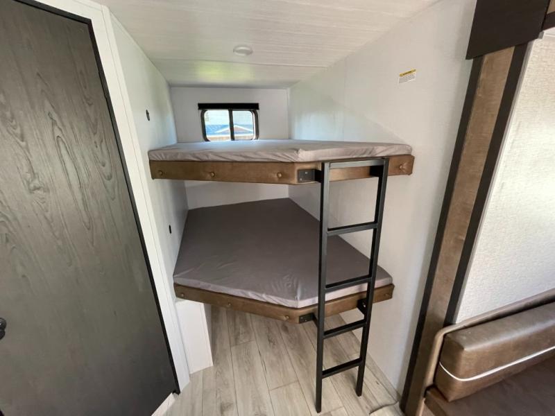 You'll have additional space to stretch out in this travel trailer for eight to ten! Within the slide you'll find the booth dinette and sofa that will be perfect for meal times, relaxing, and sleeping more guests, and there is an entertainment with TV prep for movie nights. The little ones will love the double-size bunks, and the full bath is close by for easy nighttime use. You'll have the front private bedroom with a queen bed all to yourselves, plus there are dual closets and nightstands for your things. This model also includes an exterior pass-through storage outside and a 16' power awning for protection against the sun!