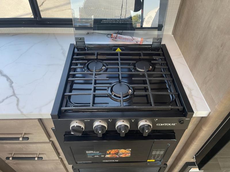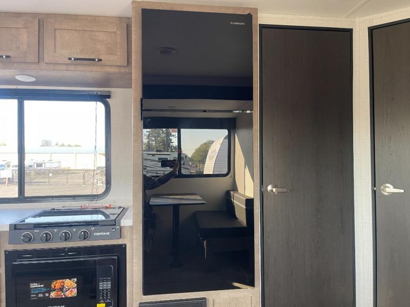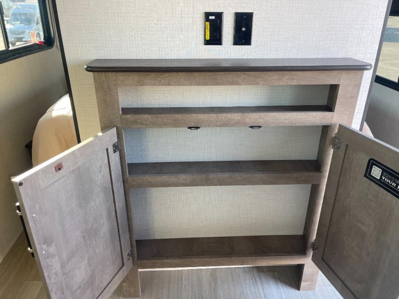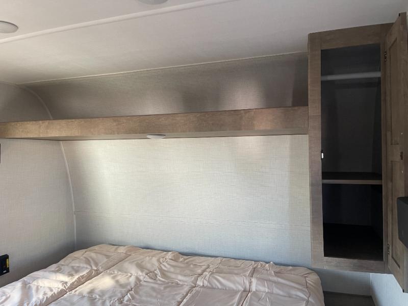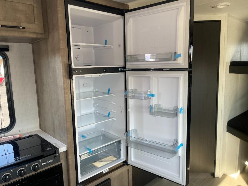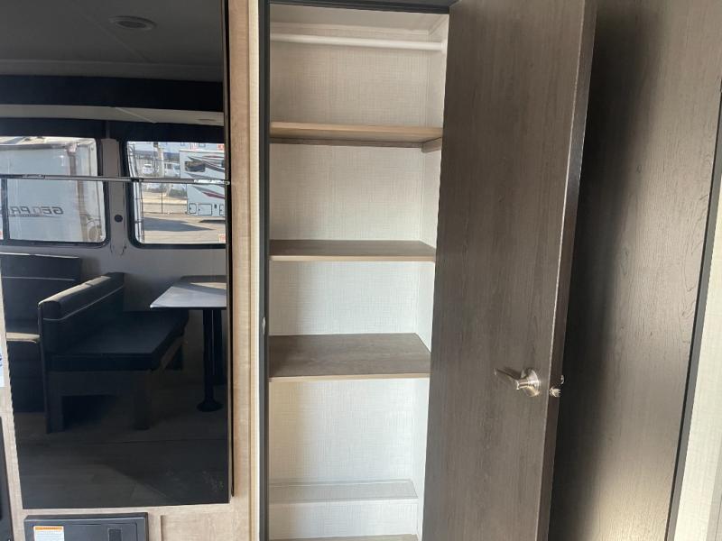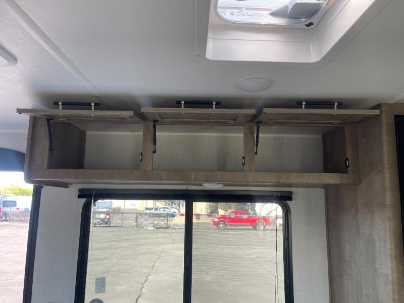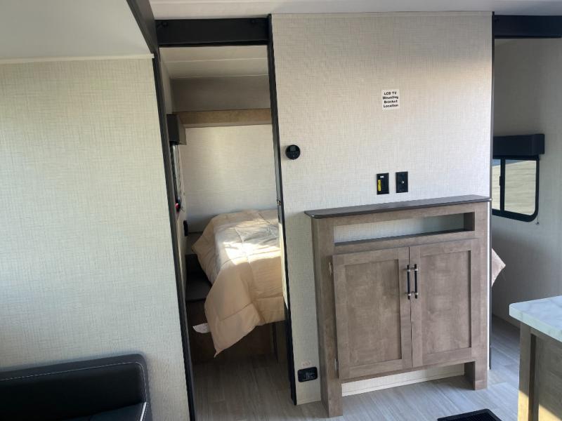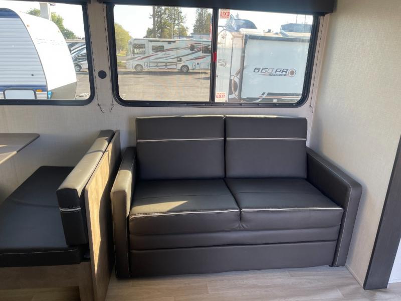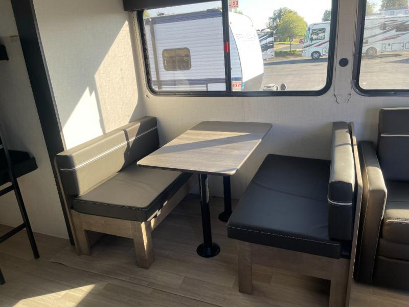 You'll have additional space to stretch out in this travel trailer for eight to ten! Within the slide you'll find the booth dinette and sofa that will be perfect for meal times, relaxing, and sleeping more guests, and there is an entertainment with TV prep for movie nights. The little ones will love the double-size bunks, and the full bath is close by for easy nighttime use. You'll have the front private bedroom with a queen bed all to yourselves, plus there are dual closets and nightstands for your things. This model also includes an exterior pass-through storage outside and a 16' power awning for protection against the sun!